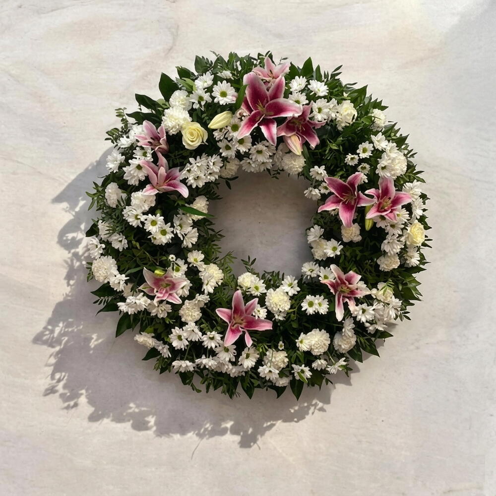 rosas - 3 шт. claveles - 10 шт. lirios - 5 шт. хризантемы - 40 шт. траурная лента - 1 шт. разнообразная сезонная зелень - 20 шт. кольцо 50 см - 1 шт.