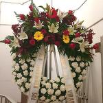Эта элегантная траурная цветочная композиция состоит из 50 белых гвоздик, символизирующих чистоту и безусловную любовь. Её дополняют 8 белых лилий, олицетворяющих величие и достоинство. Десять красных роз, выражающих уважение и доблесть, украшают композицию. Четыре жёлтые герберы символизируют глубокое уважение и восхищение любимым человеком. Четыре красных гладиолуса символизируют силу характера, честь и память. Пять листьев папоротника и декоративные пальмовые листья придают композиции красивую текстуру и глубину. Эта цветочная композиция – дань уважения и любви, которая поможет выразить ваши самые глубокие чувства.