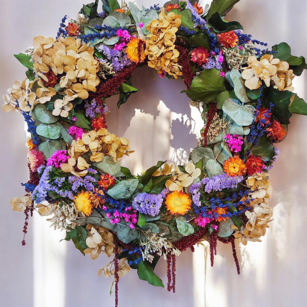 Разнообразный венок из стабилизированных цветов