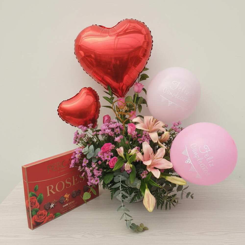Эта радостная и романтичная композиция — идеальное сочетание, чтобы отпраздновать особенный день с нежностью и волнением. Цветы в розовых тонах передают нежность и свежесть, а шары в форме сердца и шарики для дня рождения добавляют праздничную, наполненную нежностью нотку. Лилии и розы делают композицию элегантной и очаровательной, идеально подходящей, чтобы порадовать дорогого человека. Кроме того, в неё входит вкусная коробка шоколадных конфет, которая делает этот подарок полноценным и незабываемым. Его яркий и праздничный дизайн делает его идеальным выбором для дней рождения, полных радости и любви. Это больше, чем подарок: это послание нежности, которое озаряет сердца.