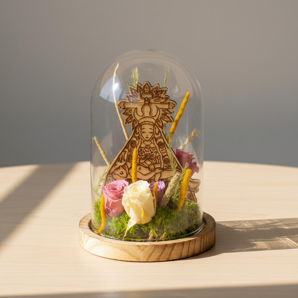 Изделие, полное смысла, красоты и умиротворения. Под изящной стеклянной куполой находится фигурка, вырезанная из дерева, в окружении стабилизированных цветов в мягких натуральных тонах. Композиция размещена на деревянной основе, подчёркивающей её тёплый ремесленный шарм. Этот дизайн сочетает духовность и природу, создавая декоративный объект, который передаёт покой и гармонию. Идеально подходит в подарок или для размещения в особом уголке дома как символ веры и любви. Каждая деталь была тщательно выполнена, чтобы сохранять свою красоту с течением времени.
