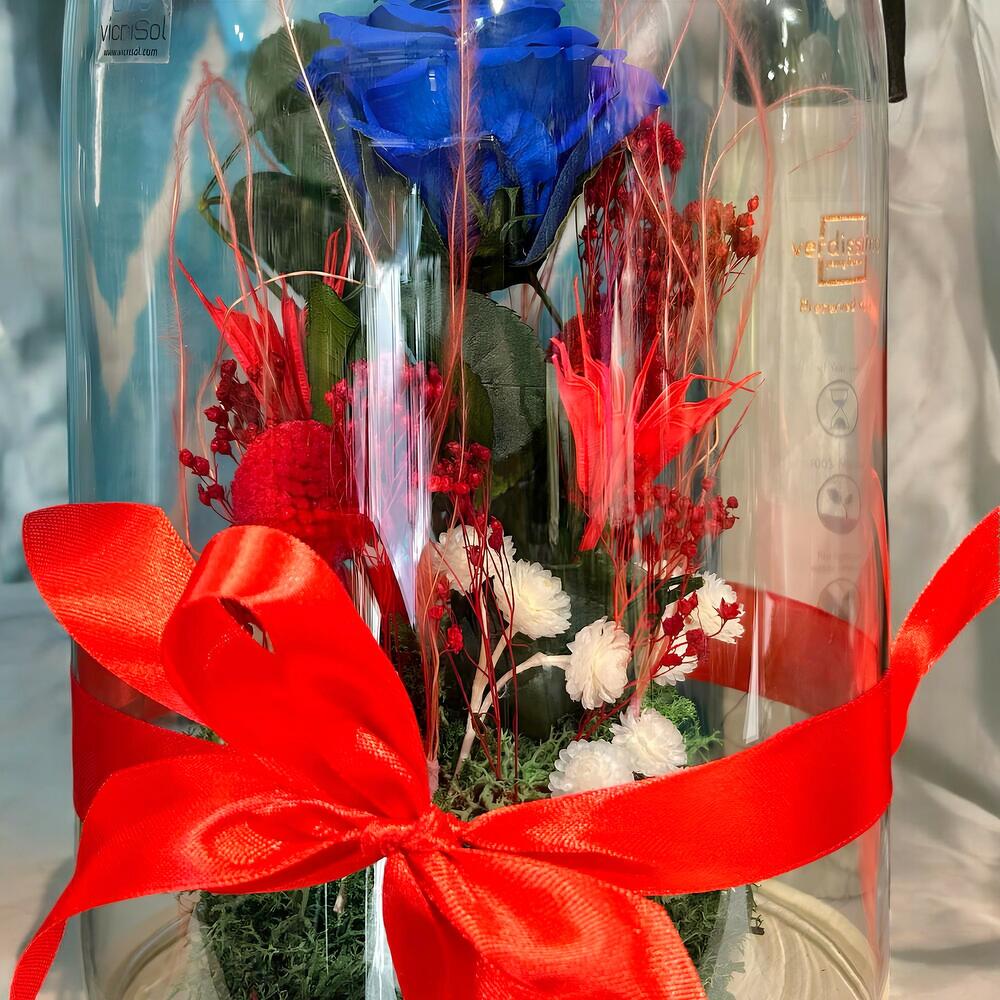 «Зачарованная голубая роза» – это цветочное произведение искусства, сочетающее в себе элегантность и таинственность стабилизированной синей розы, обрамлённой нежными сухоцветами и натуральным мхом. Находящееся под стеклянным куполом, это произведение идеально подходит для украшения особых мест и передачи послания вечной любви и оригинальности. Красная атласная лента добавляет нотку изысканности и идеально подходит для незабываемого подарка.