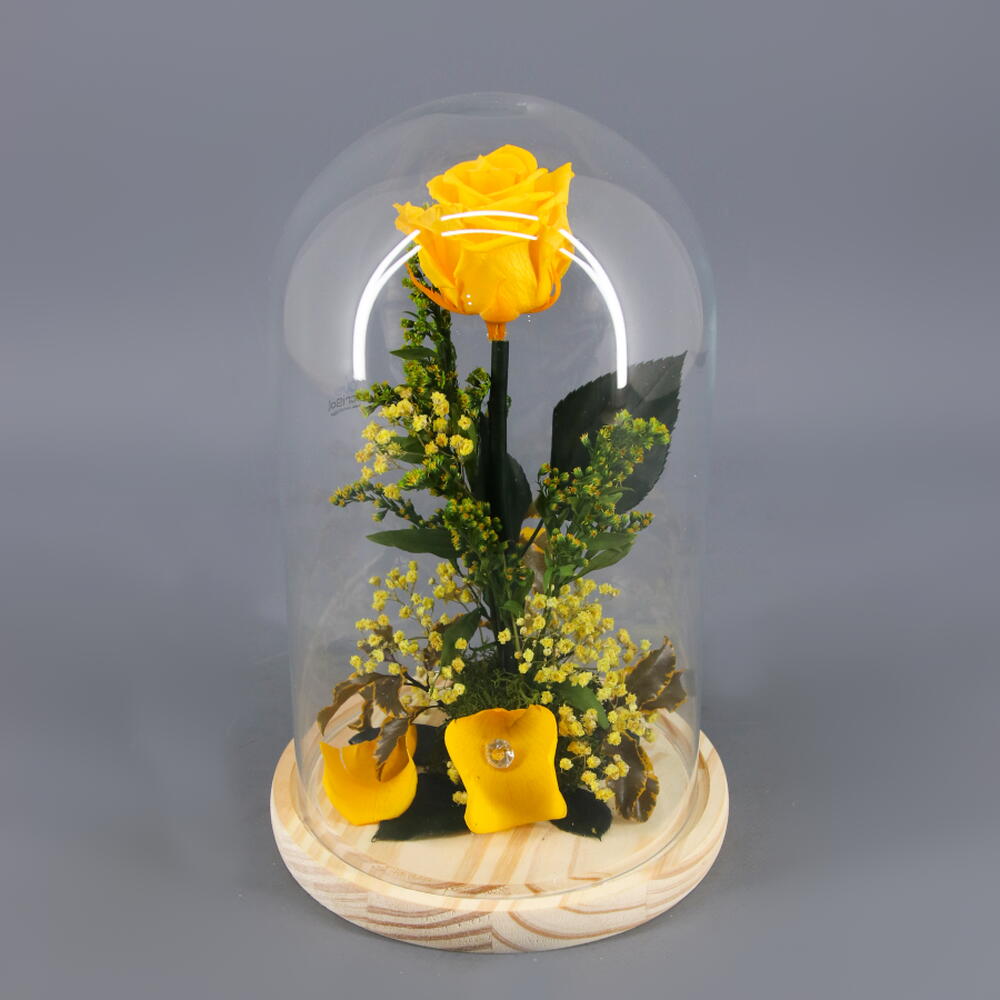 стеклянный купол с деревянной подставкой - 1 шт. жёлтая стабилизированная роза - 1 шт. жёлтая стабилизированная паникулата - 1 шт.