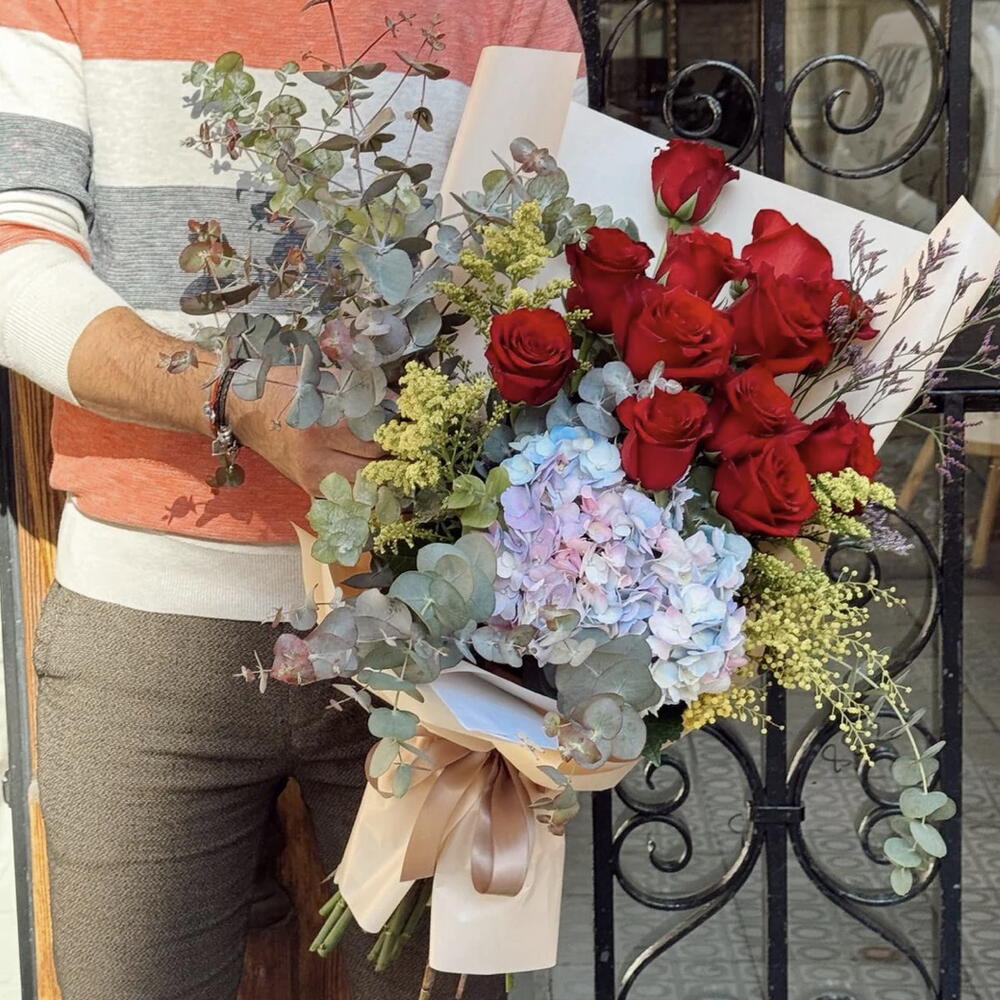 Limonium - 1 шт. hortensia - 1 шт. eucalipto - 7 шт. rosas rojas - 12 шт.