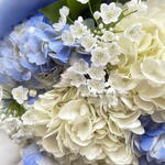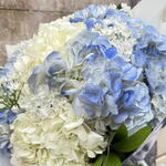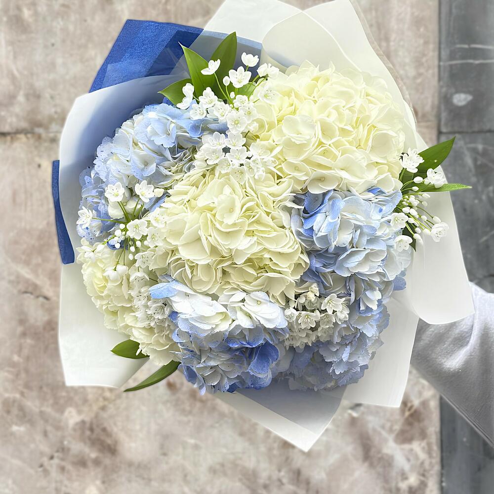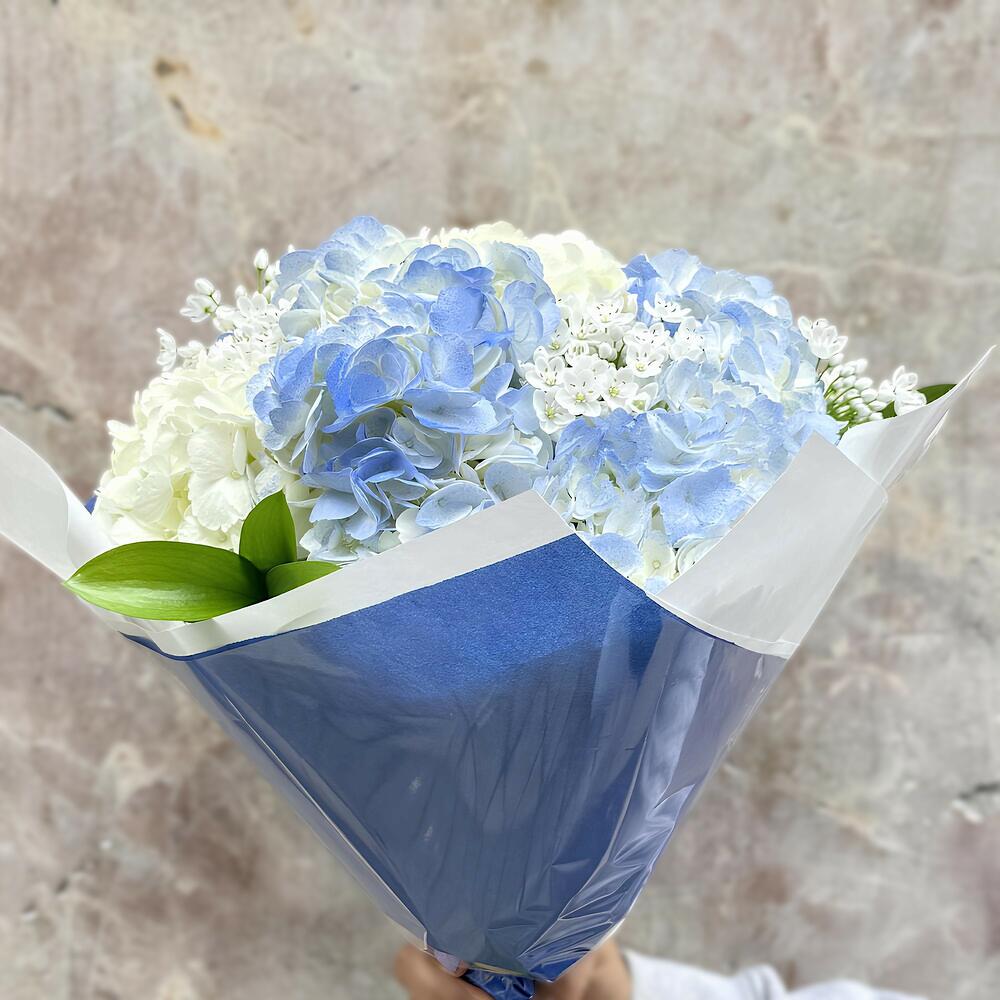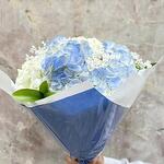 Этот фирменный продукт представляет собой изящную композицию из семи бело-голубых гортензий и трёх веток рускуса. Этот прекрасный букет, упакованный в крафт-бумагу и украшенный двумя синими шёлковыми цветами, выглядит ещё более элегантно. Он идеально подходит для подарка по любому поводу, добавив яркости и свежести любому помещению.