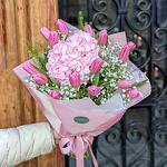 Этот яркий букет сочетает насыщенно-розовые тюльпаны, нежные гортензии и немного гипсофилы, создавая идеальный контраст между нежным и смелым. Идеален, чтобы озарить любой повод и передать энергию, страсть и любовь.