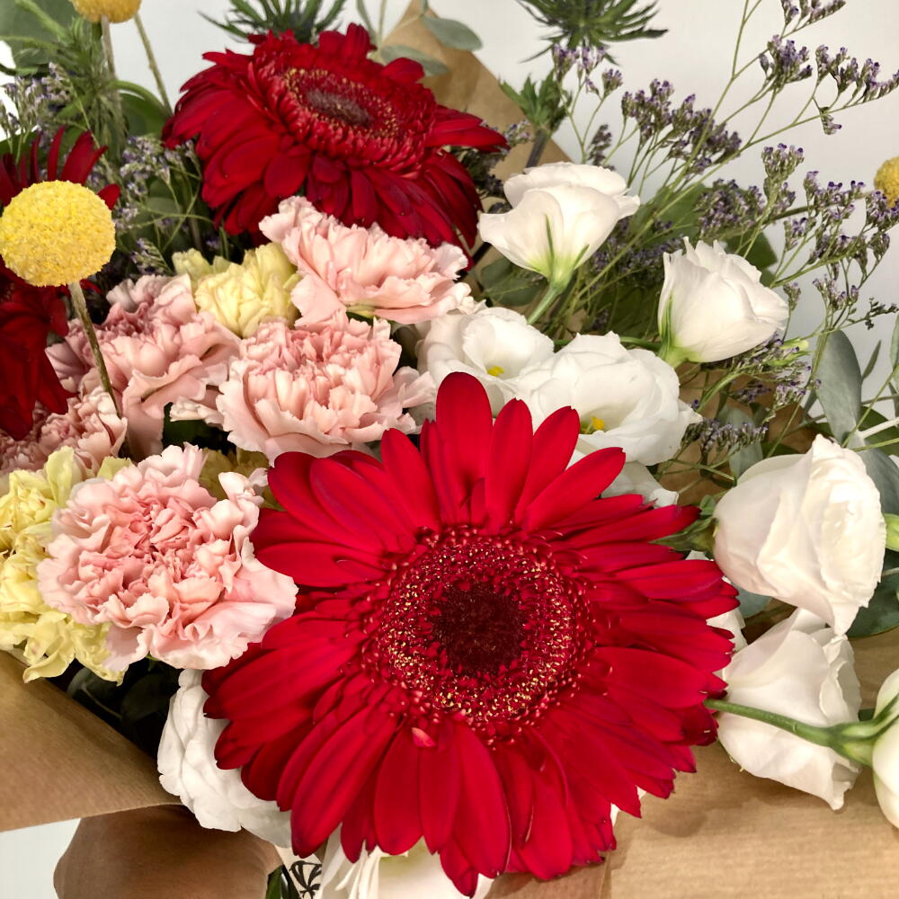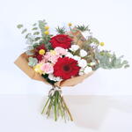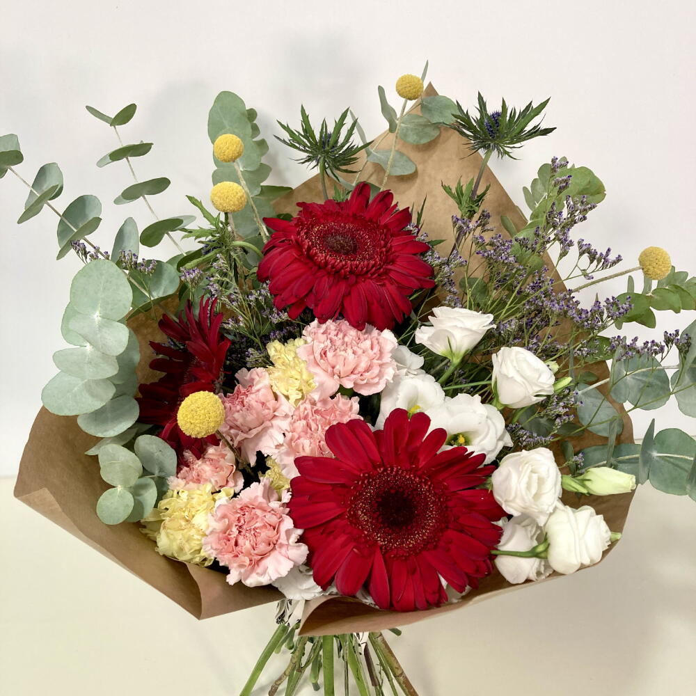 Gerbera - 3 шт. eucalipto - 5 шт. eryngium - 3 шт. краспедии - 5 шт. розовые гвоздики - 5 шт. жёлтые гвоздики - 5 шт. лизиантус или белые мини розы - 3 шт.