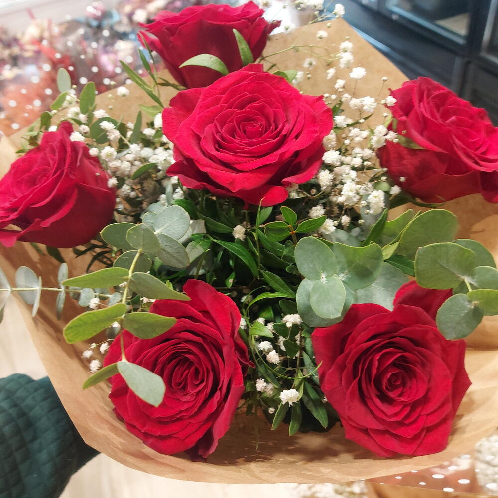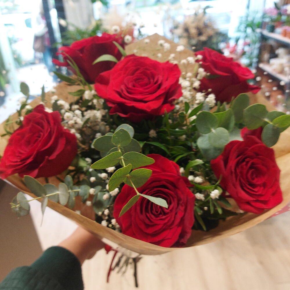 paniculata - 2 шт. листья аспидистры - 3 шт. красная роза - 6 шт.