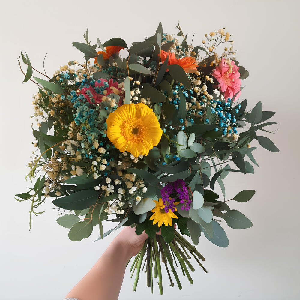 Этот замечательный авторский букет мастерски сочетает жизненную силу и элегантность. Он состоит из соблазнительной желтой герберы, двух очаровательных розовых гербер и двух жизнерадостных оранжевых гербер, добавляющих нотку свежести и живости. Мягкая натуральная белая гипсофила и эффектная гипсофила, окрашенная в синий, вносят нотку утончённости. Наконец, эвкалипт добавляет завершающий штрих своим освежающим ароматом и уникальным видом. Этот букет — идеальный подарок и впечатляющее дополнение к любому пространству.