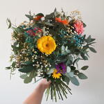 eucalipto - 3 шт. Жёлтая гербера - 1 шт. Гербера розы - 2 шт. Оранжевые герберы - 2 шт. паникулата натуральная белая - 1 шт. паникулата окрашенная в синий цвет - 1 шт.