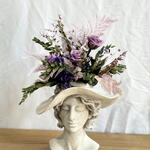 керамическая фигурка - 1 шт. пресервированные стебли парвифолии - 17 шт. консервированные сиреневые розы - 3 шт. стебли статицы лиловые - 3 шт. фиолетовые стебли статицы - 8 шт. стебли желтоватой лаванды - 16 шт. лавандовые стебли папоротника - 3 шт. стебли лимониума кораллового - 2 шт.