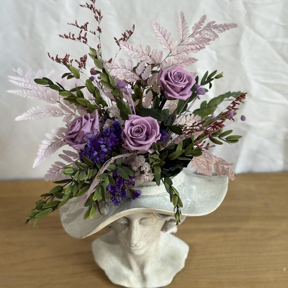 керамическая фигурка - 1 шт. пресервированные стебли парвифолии - 17 шт. консервированные сиреневые розы - 3 шт. стебли статицы лиловые - 3 шт. фиолетовые стебли статицы - 8 шт. стебли желтоватой лаванды - 16 шт. лавандовые стебли папоротника - 3 шт. стебли лимониума кораллового - 2 шт.