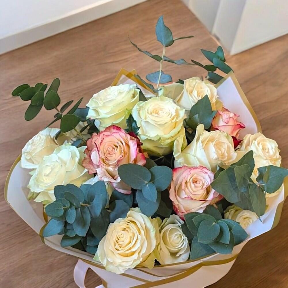 Букет белых роз с эвкалиптом
