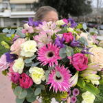 Chrysanthemum - 3 шт. Alstroemeria - 4 шт. Basket - 1 шт. decorative greenery - 5 шт. klematis - 5 шт. Gerbera fucsia - 3 шт. pink roses - 5 шт. spray roses pink - 3 шт. spray dianthus - 6 шт.