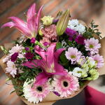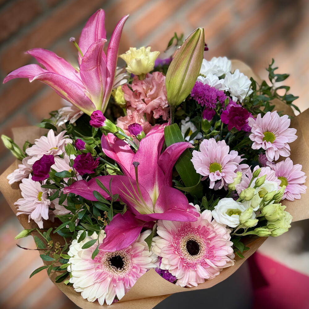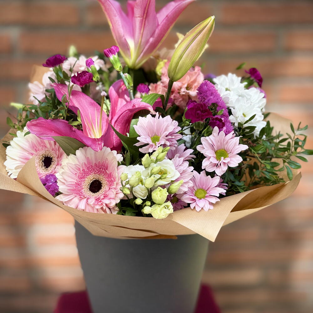Aquest ram lleuger i encantador està compost en tons rosats i blancs. Combina lliris aromàtics, gerberes delicades, crisantems, eustomes, clavells i verdor de temporada. El contrast entre tons vius i suaus fa que la composició sigui viva però elegant. L’aroma subtil dels lliris afegeix un toc especial d’encant. És un regal perfecte per expressar sentiments, agraïment o simplement per portar alegria sense cap motiu. La mida del ram és més gran que la mitjana. Envoltat en paper craft decoratiu que harmonitza amb els colors de les flors.