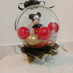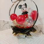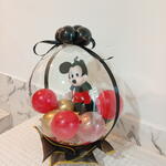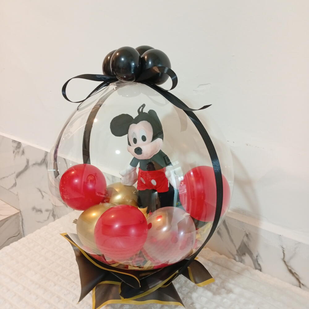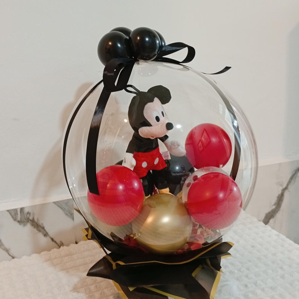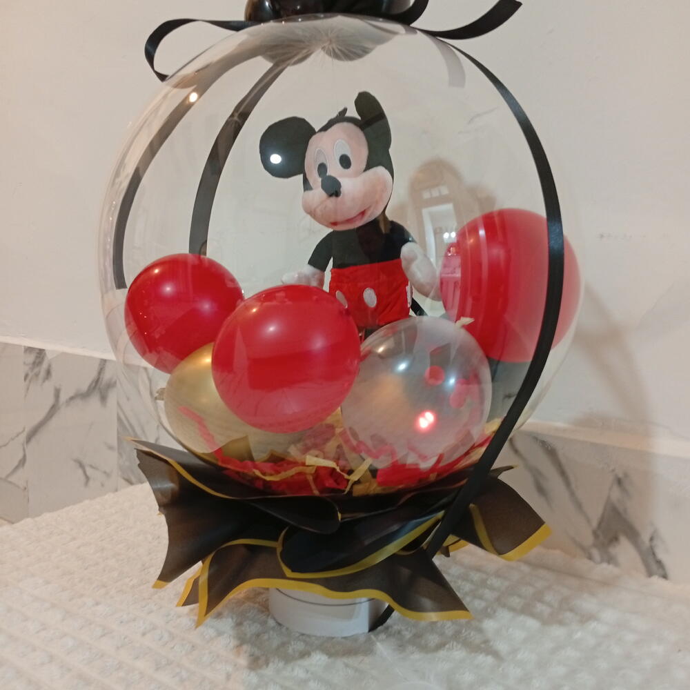 Милый плюшевый Микки Маус, инкапсулированный в гигантском кристально-прозрачном шаре, помещённый в белую роскошную коробку; внутри — шарики и конфетти красного и жёлтого цветов, а также подходящие маленькие шарики.