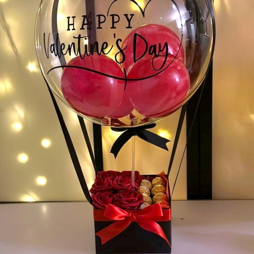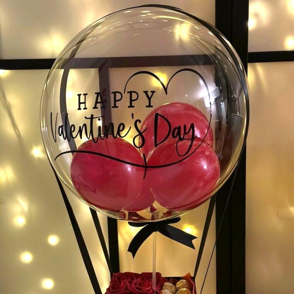 Удивите этим элегантным персонализированным шаром-бабл с надписью Happy Valentine’s Day в комплекте с коробкой, украшенной красными розами и вкусными шоколадными конфетами Ferrero Rocher. Романтичный, современный и сладкий подарок, который сочетает визуально впечатляющее оформление с самым изысканным вкусом. Идеально для Дня святого Валентина, годовщин или запоминающихся признаний в любви. Рекомендации по уходу: Избегайте прямой экспозиции на солнце или источников тепла, чтобы сохранить шар и шоколад в оптимальном состоянии. Розы могут дольше сохраняться, если держать их в прохладном месте. Шар сохраняет надувную форму примерно 3–5 дней, в зависимости от условий окружающей среды. Идеально вручать в тот же день празднования для максимального визуального эффекта.