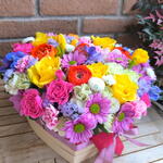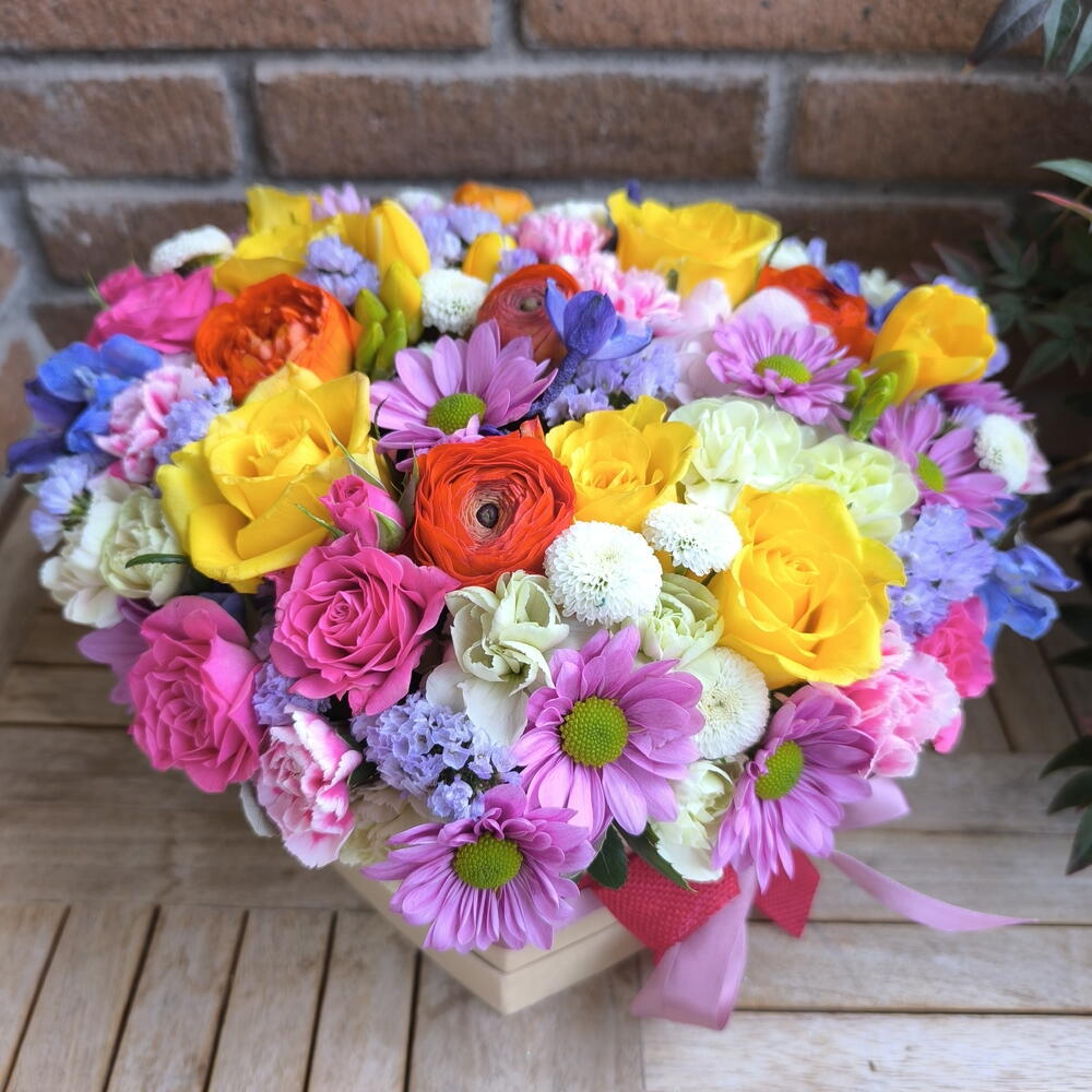 Ribbon - 2 шт. flower box - 1 шт. crisantemos - 2 шт. spray roses - 3 шт. delfinium azul - 2 шт. yellow roses - 5 шт. spray dianthus - 5 шт.