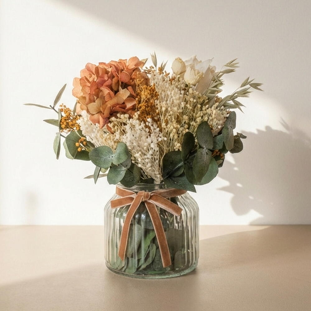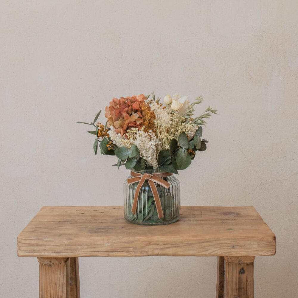 Ваза с стабилизированными цветами Bebé — самая нежная и компактная версия наших стабилизированных цветочных композиций. Созданная, чтобы привнести тепло и натуральную нотку в любой уголок, она идеально подходит для приставных столиков, полок, прикроватных тумбочек или небольших прихожих, где хочется добавить деталь, не перегружая пространство. В её составе сочетаются стабилизированные цветы в мягких и натуральных тонах — бежевые, кремовые и зелёные оттенки с пудровыми нотками — что создаёт гармоничное и вневременное равновесие. Несмотря на компактные размеры, эта ваза выделяется своей красотой и тщательным подбором фактур, превращаясь в декоративный предмет, который вносит свет и умиротворение в атмосферу. Поскольку это стабилизированные цветы, они сохраняют внешний вид неизменным в течение длительного времени без необходимости ухода.