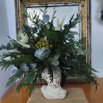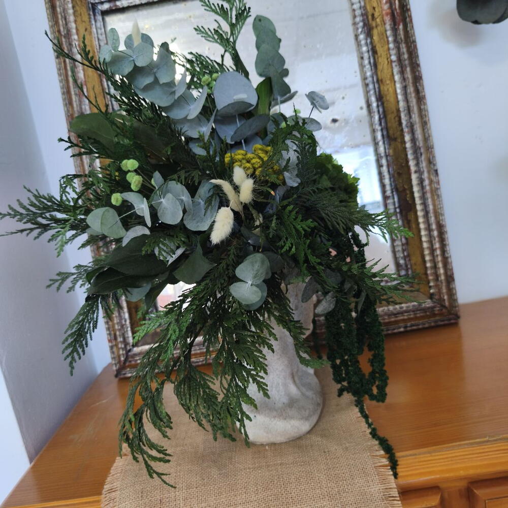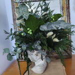 стабилизированный эвкалипт - 12 шт. стабилизированная зеленая гортензия - 1 шт. стабилизированная туя - 12 шт. керамическая голова - 1 шт. зелёные лангуры - 12 шт. зелёный амарант - 6 шт. зеленая кнопка - 12 шт. стабилизированный салал - 8 шт.