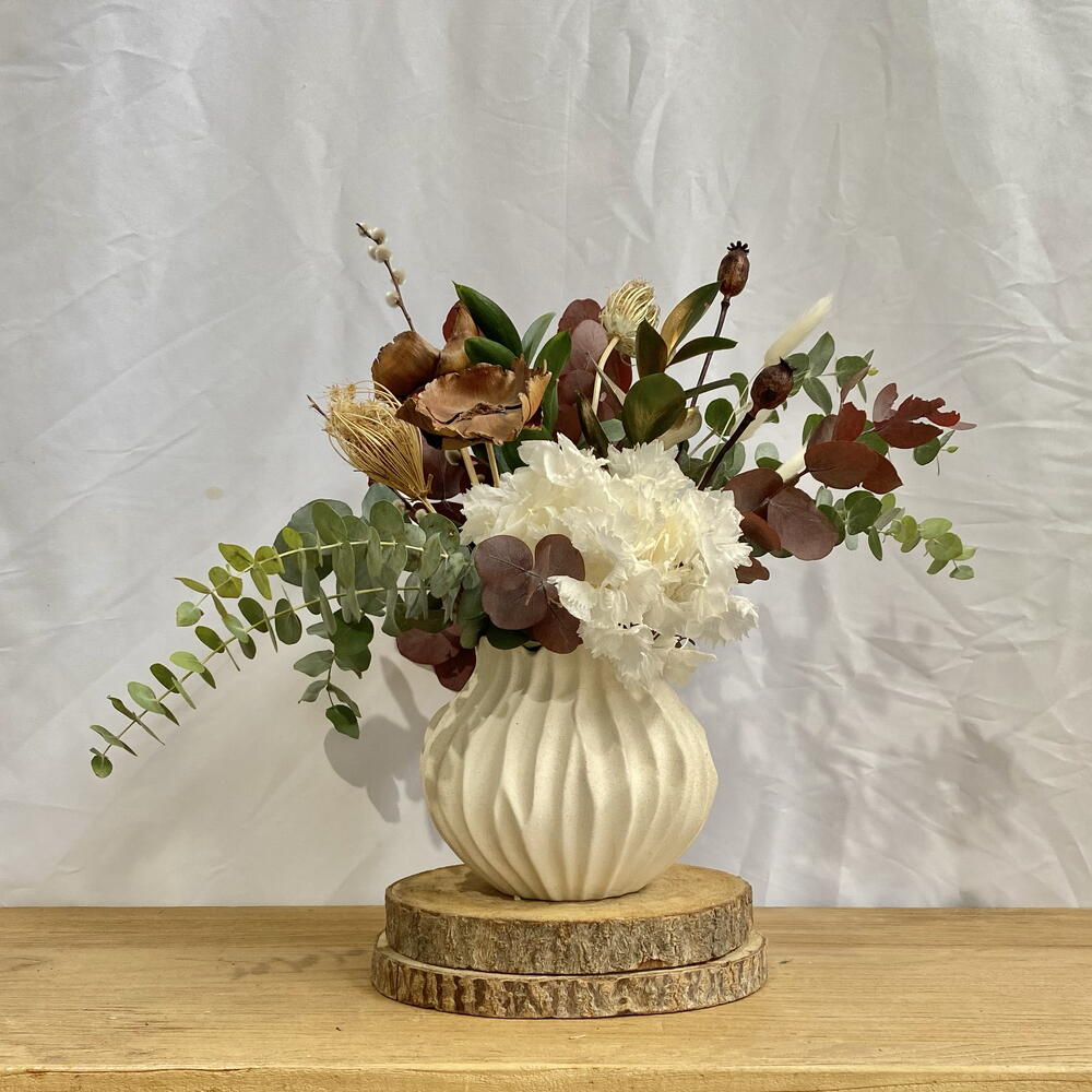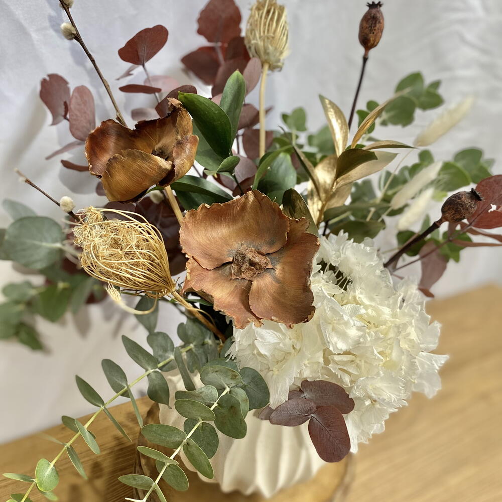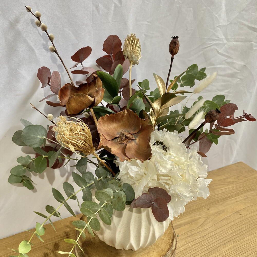 белый лагурус - 3 шт. стабилизированная белая гортензия - 1 шт. эвкалипт цинерея - 1 шт. цветок из натуральной кедровой древесины - 2 шт. коричневый мак - 2 шт. эвкалипт цинерея окрашенный бордовый - 1 шт. рускус окрашенный в золотой цвет - 1 шт. натуральный рускус - 1 шт. ива снежинка - 2 шт. чертополох болотный - 2 шт.