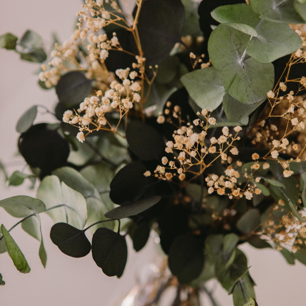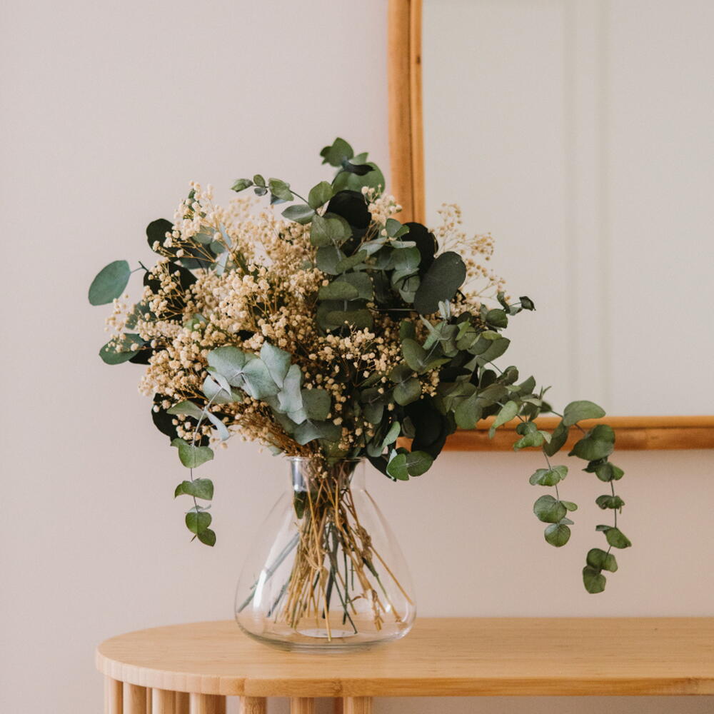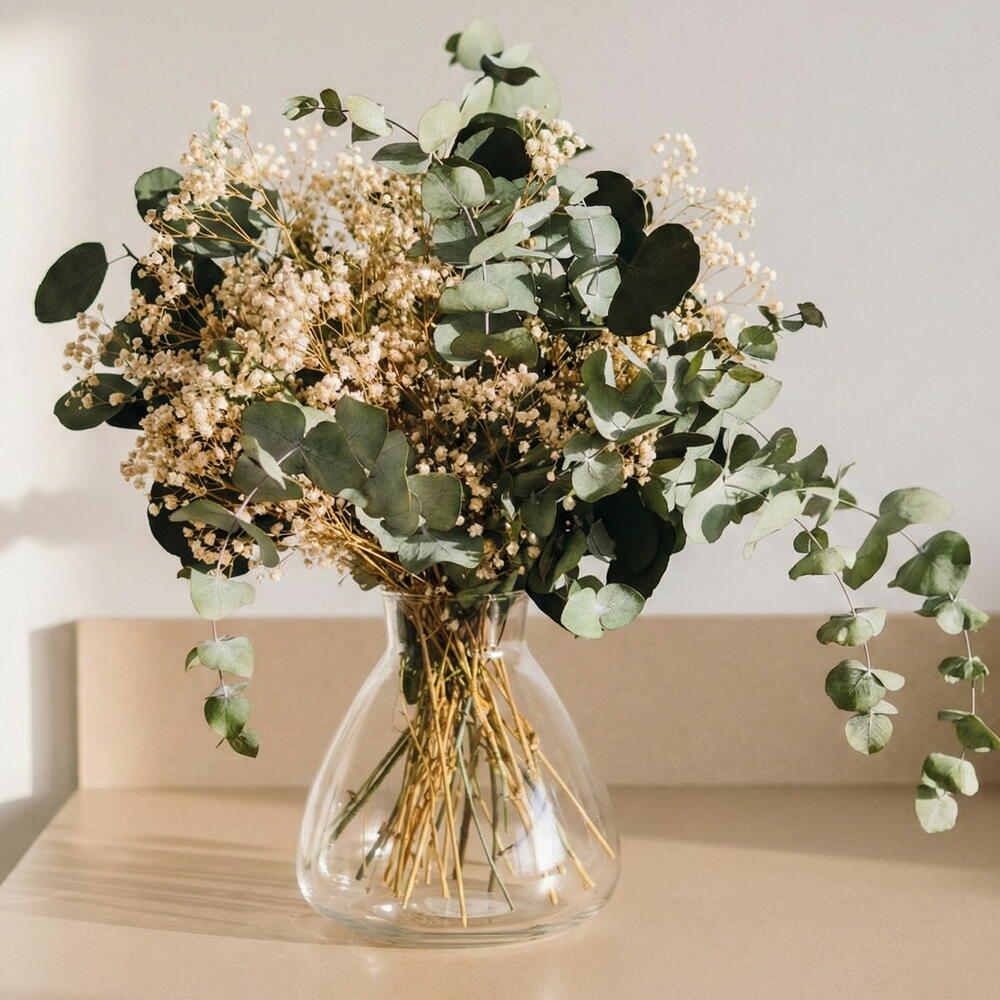Ваза с белой гипсофилой и стабилизированным эвкалиптом – натуральная и вневременная цветочная композиция