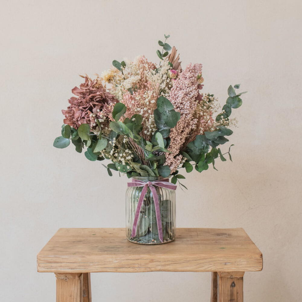 Ваза стандартного размера с натуральными стабилизированными цветами в пыльных тонах – вневременный декоративный цветочный центр