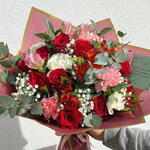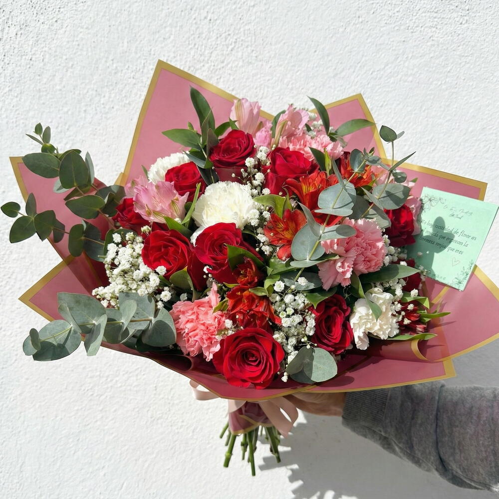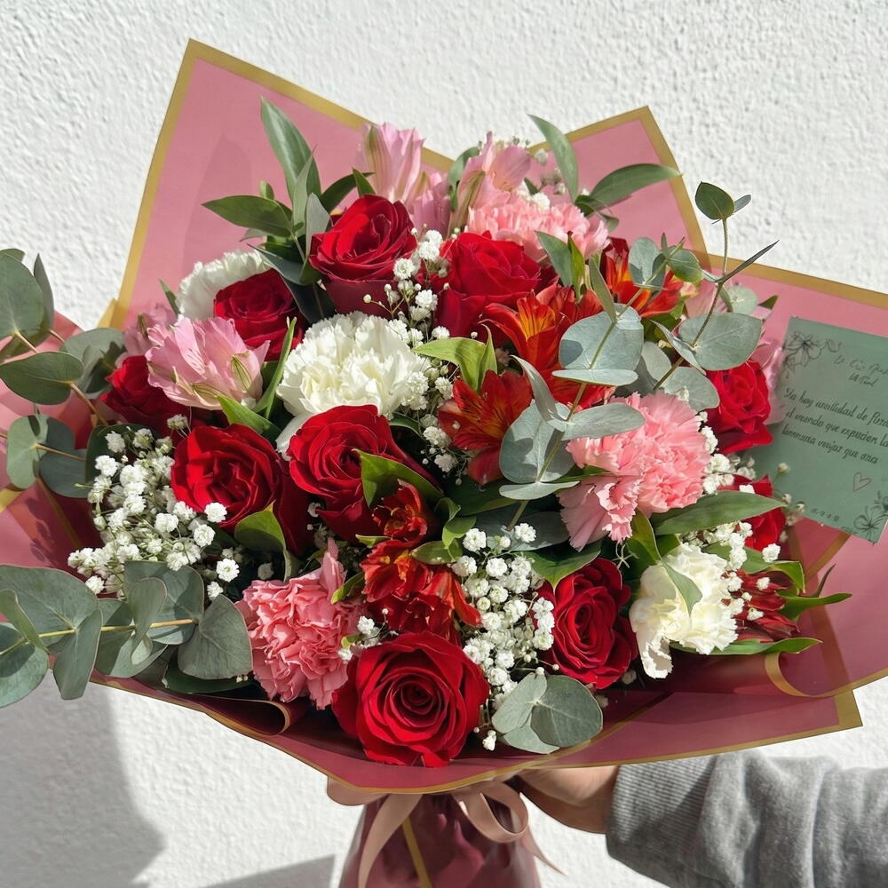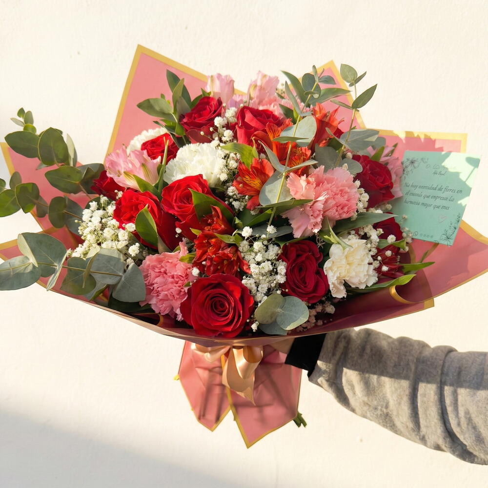 Состоит из обильного выбора красных роз, в сочетании с гвоздиками розовых и белых оттенков, альстромериями, нежной гипсофилой и натуральной листвой, такой как эвкалипт, которые придают композиции свежесть, объем и баланс. Сочетание красных, розовых и зеленых тонов создаёт букет, полный романтики, интенсивности и элегантности, идеальный для выражения глубокой любви, важных торжеств или моментов, которые стоит запомнить.