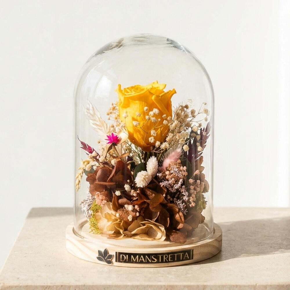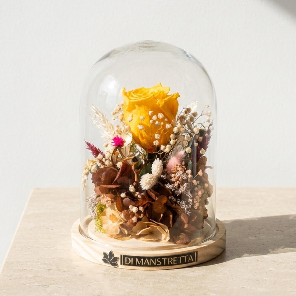 Красавица и Чудовище — наша цветочная интерпретация этой вечной сказки: стеклянный купол, оберегающий стабилизированную жёлтую розу, символ истинной любви, надежды и преображения. Волшебный штрих, который долго сохраняется и покоряет своей нежностью.