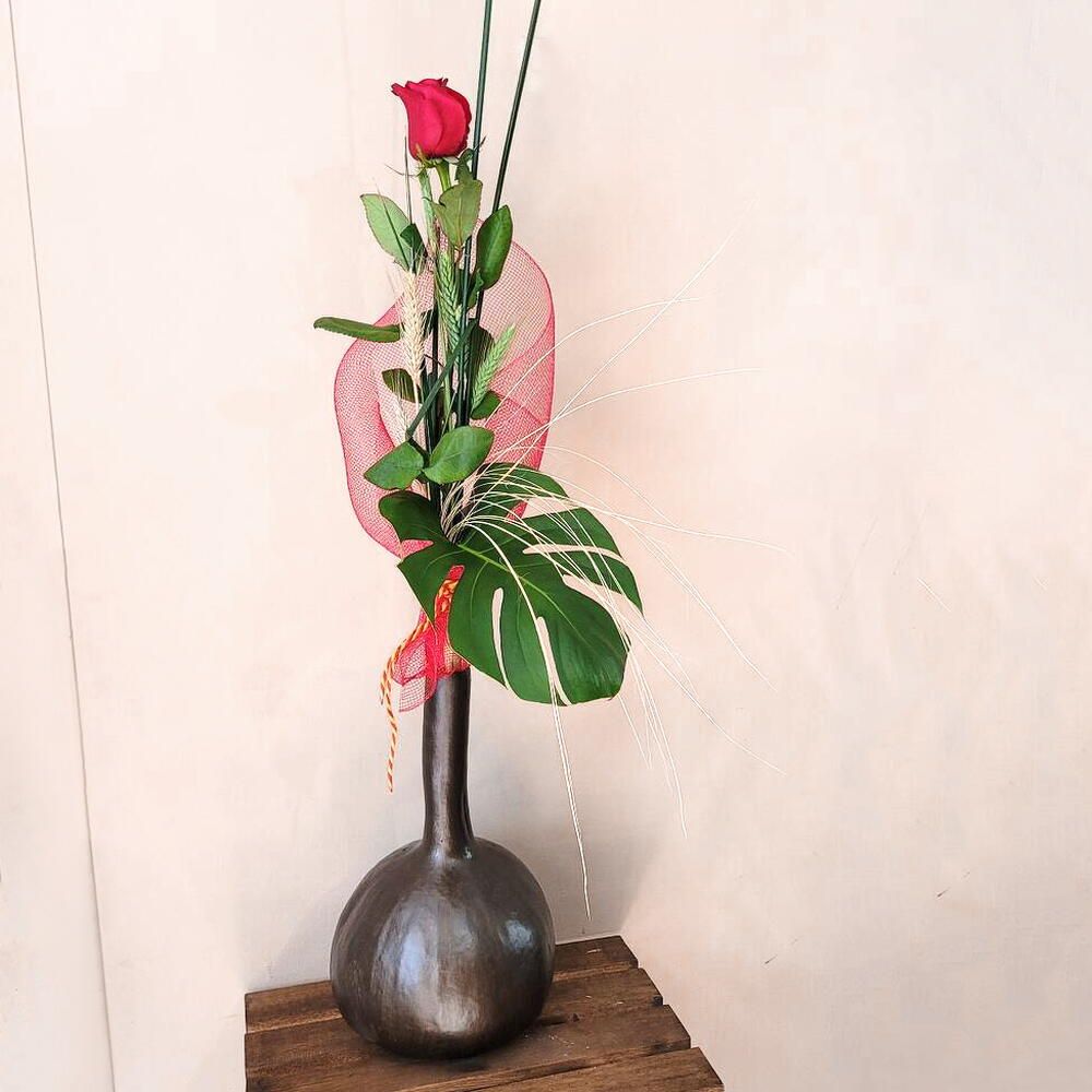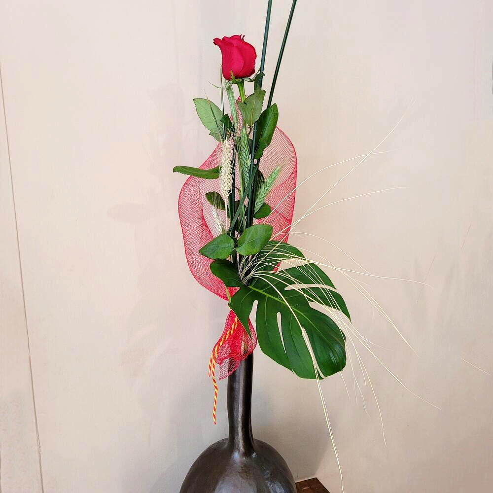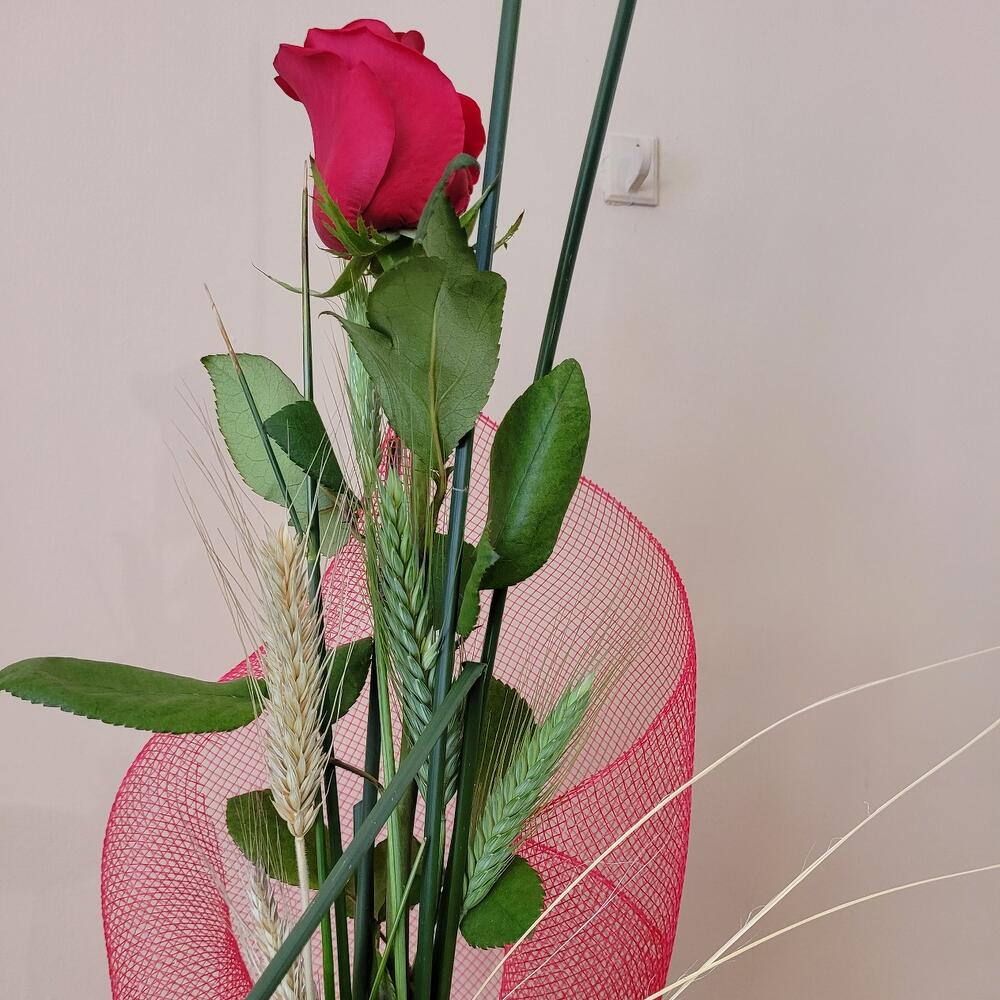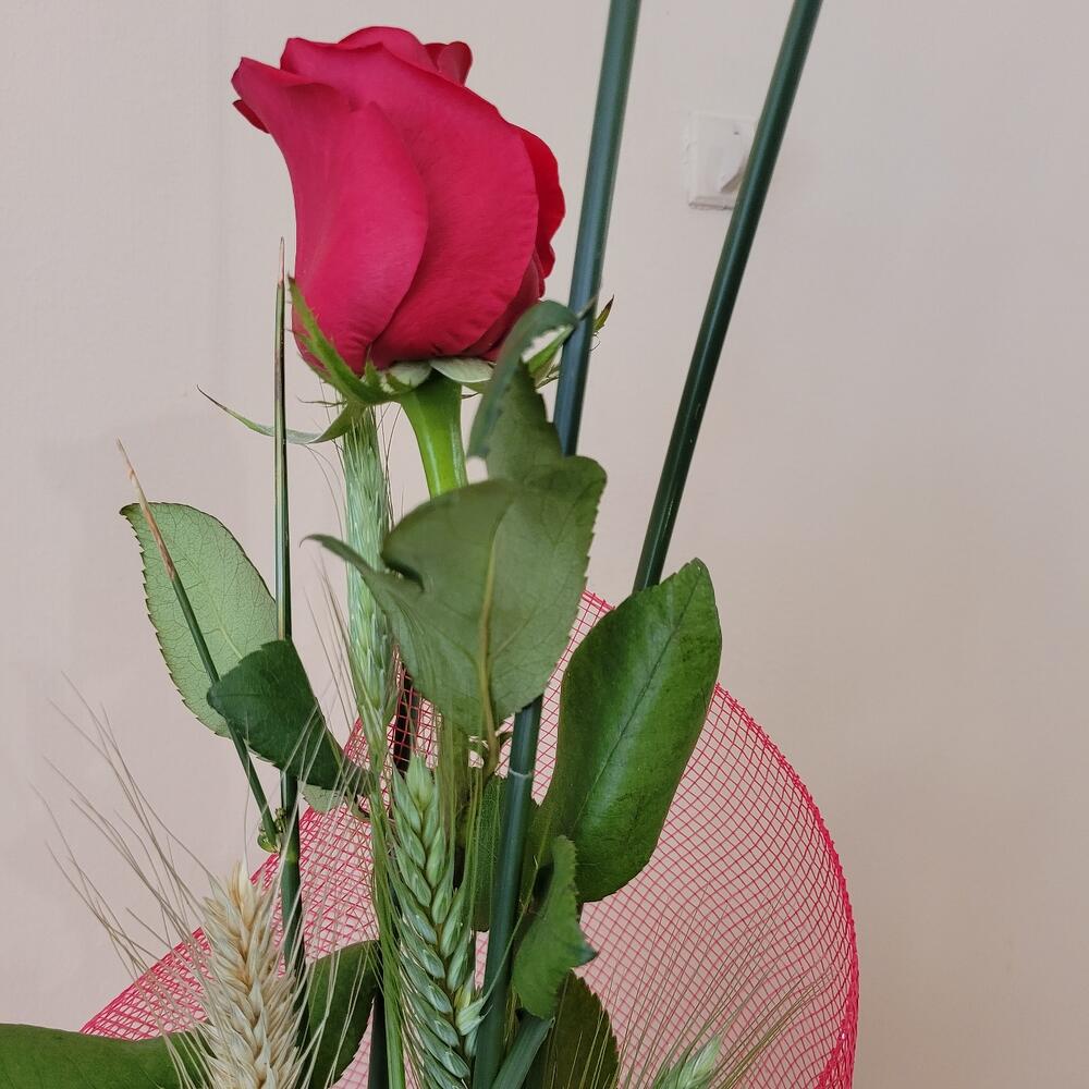красная роза - 1 шт. карточка с посвящением - 1 шт. лента - 3 шт. натуральные колосья - 3 шт. сухие колосья - 3 шт. камыши - 3 шт. сетчатая ткань - 1 шт.