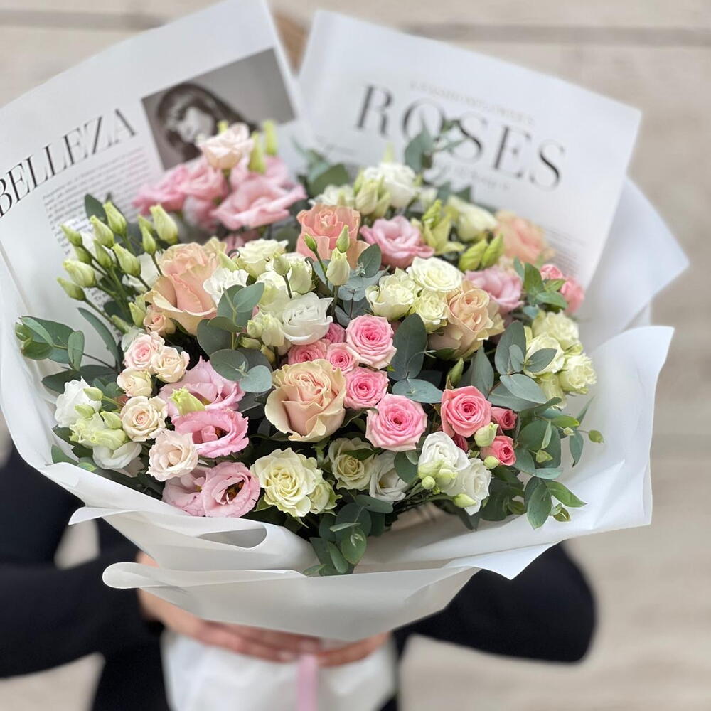 Eucalyptus - 5 шт. Spray rose - 8 шт. Lisianthus - 10 шт. rose - 5 шт.