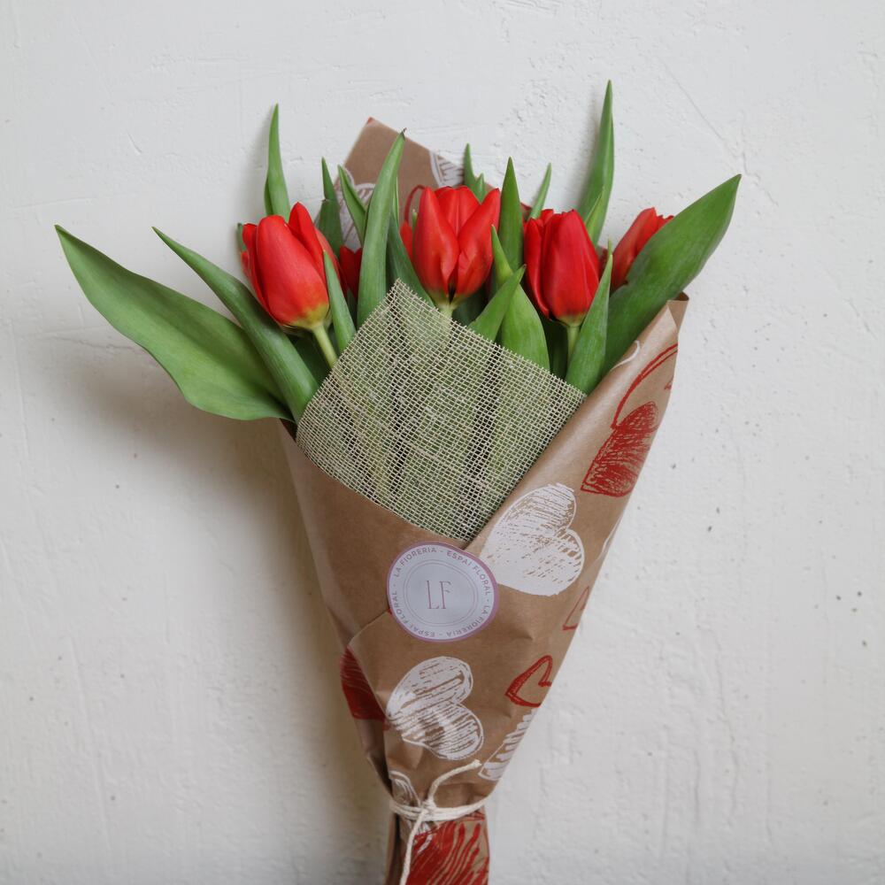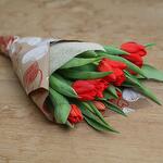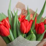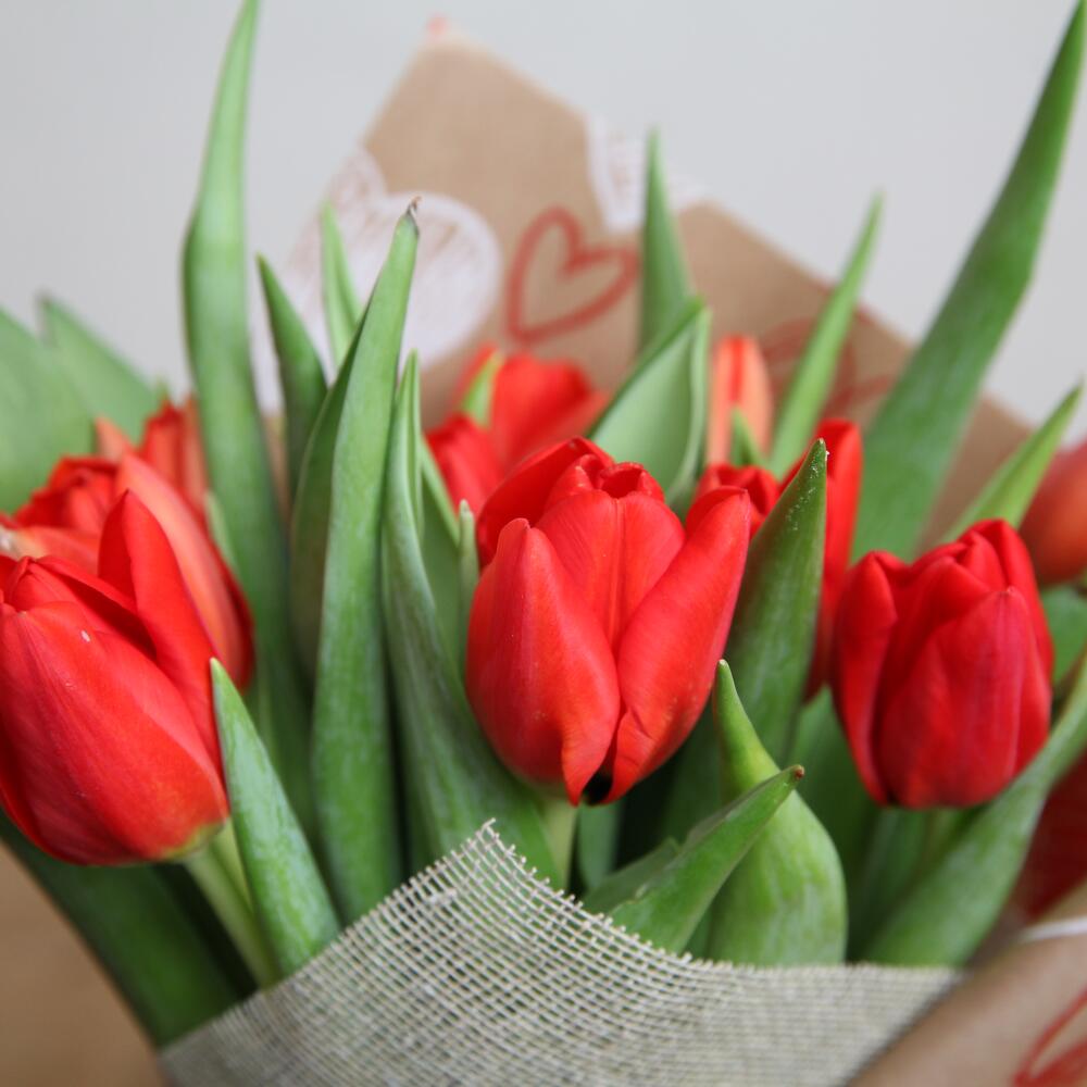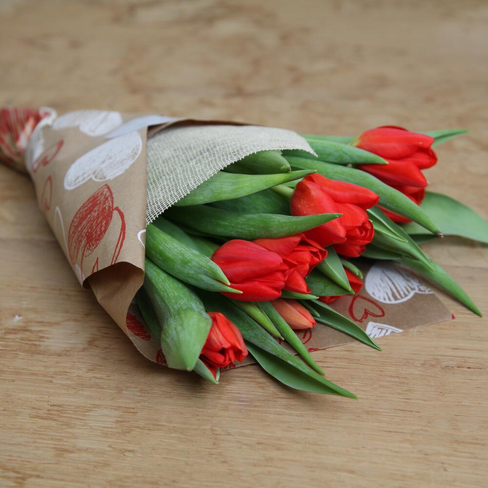 Букет из 10 красных тюльпанов, завернутых в натуральную крафт-бумагу с принтом сердечек и тканью из мешковины кремового натурального цвета. Тюльпаны могут быть меньше и более закрытыми по сравнению с фото из-за их свежести, но через день или пару дней они достигнут такого размера. Букет из десяти тюльпанов в смеси весенних цветов, завернутых в натуральную крафт-бумагу с принтом сердечек и с мешковиной на лицевой стороне. Размер тюльпанов может отличаться от показанных на изображениях из-за их свежести, хотя через день или пару дней они достигнут такого размера.