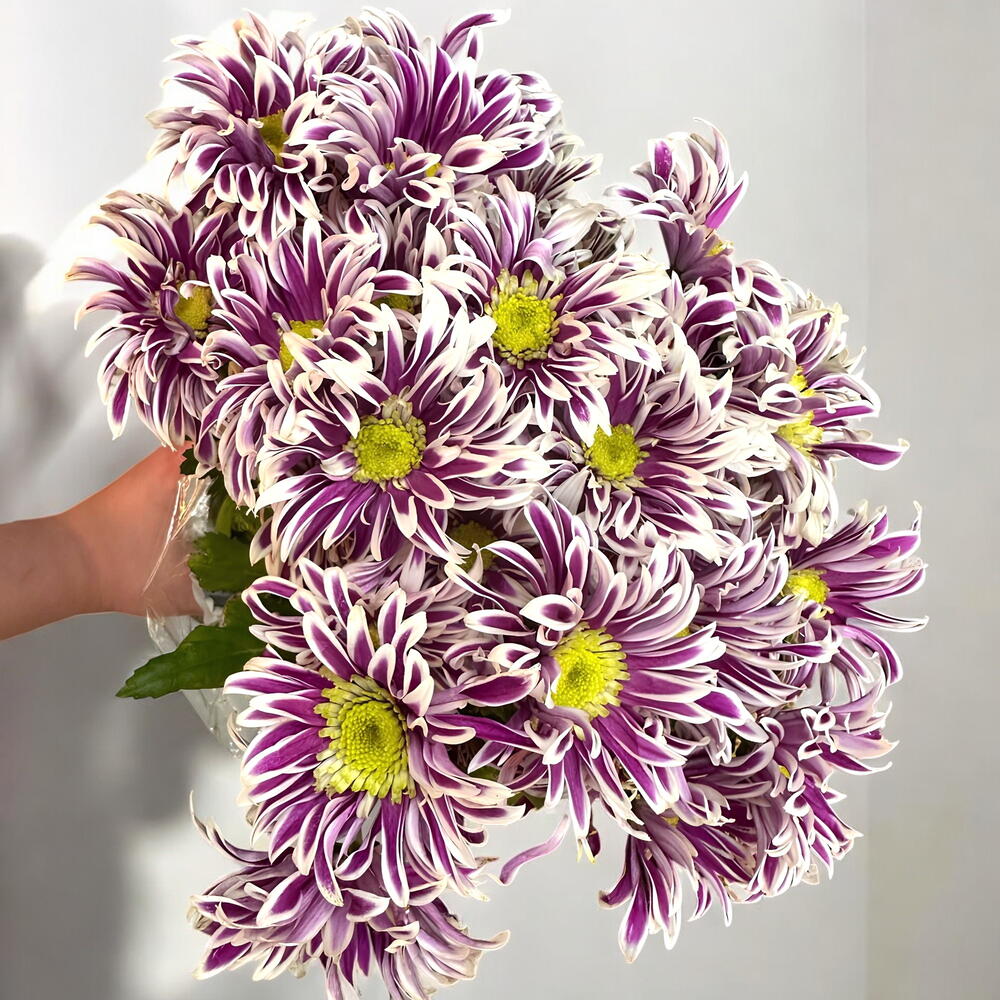 Этот эффектный букет с цветами фиолетовых и белых тонов похож на картину, вышедшую из сна. Нежные изгибы лепестков и контраст с жёлтыми серединками излучают жизненную силу и элегантность. Идеально подходит для празднования особых моментов или чтобы добавить свежий и цветной акцент в любое пространство, этот букет — пример красоты природы в её наивысшем проявлении. Его дизайн идеально подходит, чтобы украсить любой уголок твоего дома или подарить кому-то, кто заслуживает чего-то уникального.