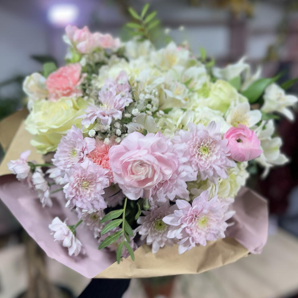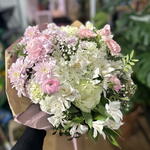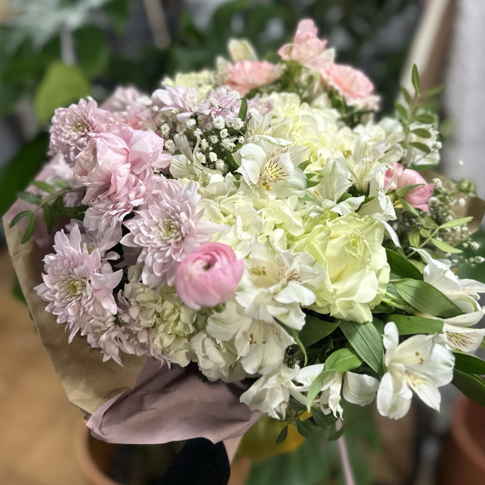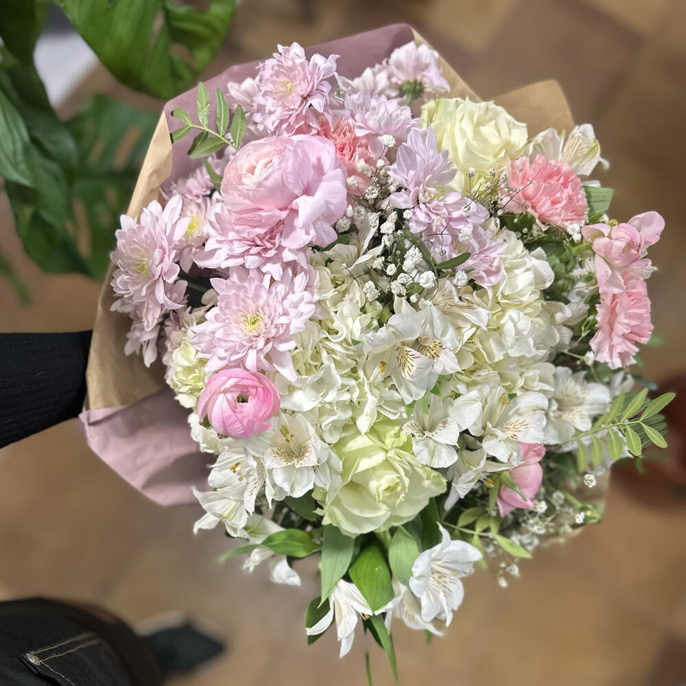 Marshmallow XL Нежный и романтичный букет, напоминающий мягкий зефир: лёгкий, воздушный и элегантный. Marshmallow XL сочетает пастельные оттенки белого, кремового и розового, создавая гармоничную и изысканную композицию, идеальную для особых случаев или в качестве подарка, полного очарования. В букет входят гортензии, метёлки, хризантемы, розовые гвоздики, альстромерии и ранункулюсы, которые вместе образуют объёмную композицию с выразительной фактурой и очень нежной эстетикой. Идеально, чтобы выразить привязанность, нежность и тепло ✨