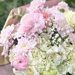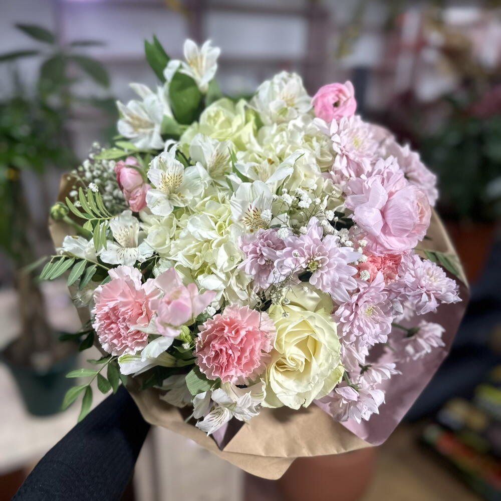 hortensia - 2 шт. ranunculus - 3 шт. paniculata - 4 шт. crisantemo - 3 шт. розовая гвоздика - 2 шт. астремелия - 6 шт.