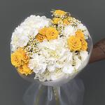 Este exquisito arreglo floral De Autor se compone de 2 suaves hortensias, 4 alegres tanacetums, 3 vibrantes claveles y 4 delicadas rosas spray. Cada flor ha sido cuidadosamente seleccionada para crear una composición armoniosa y atractiva. Un toque elegante y sofisticado para cualquier ambiente.