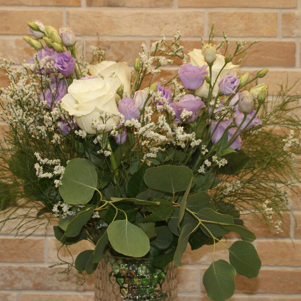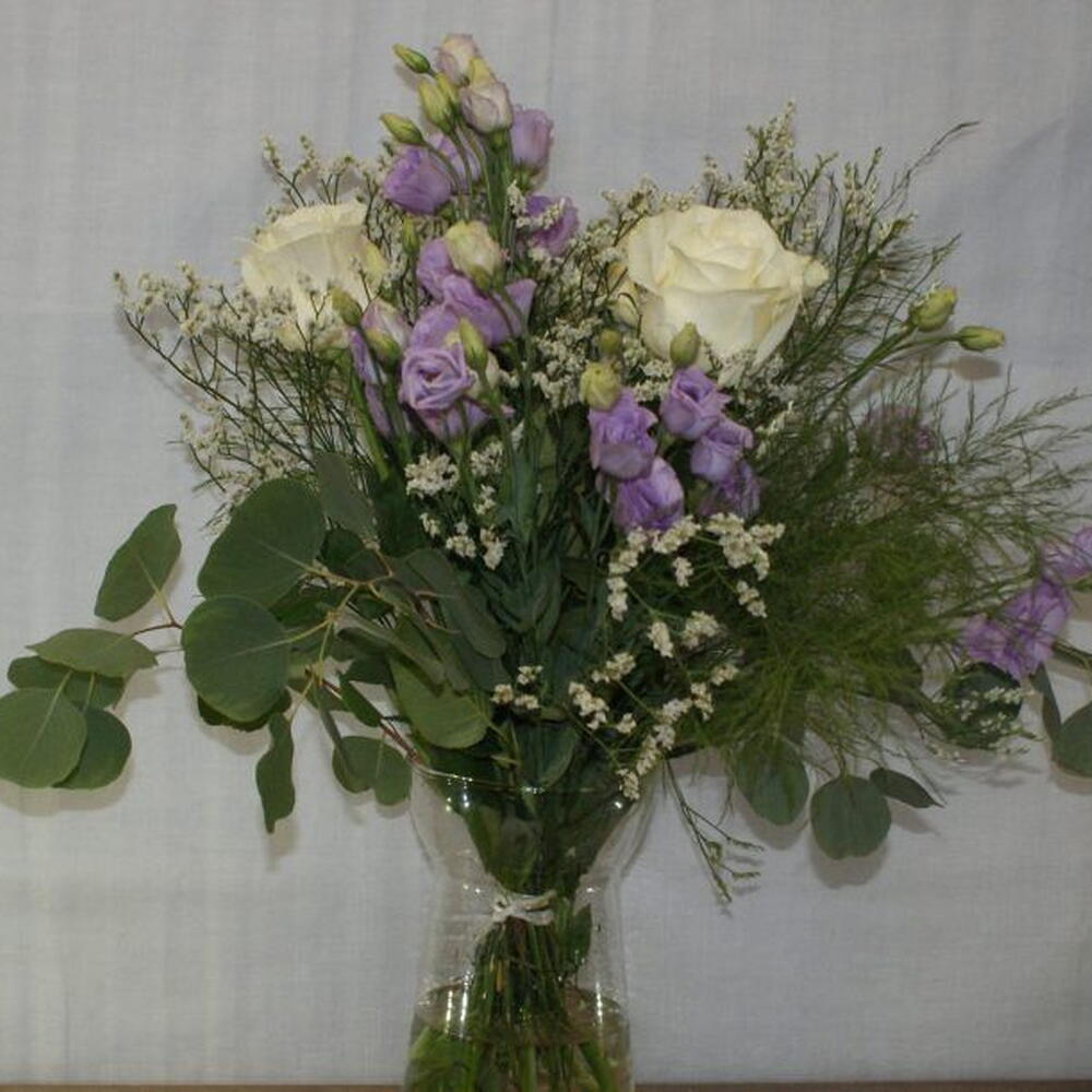 eucalipto - 3 шт. limonium blanco - 3 шт. rosas blancas - 4 шт. Лизиантус лиловый - 6 шт. декоративный зелёный аспарагус - 3 шт.