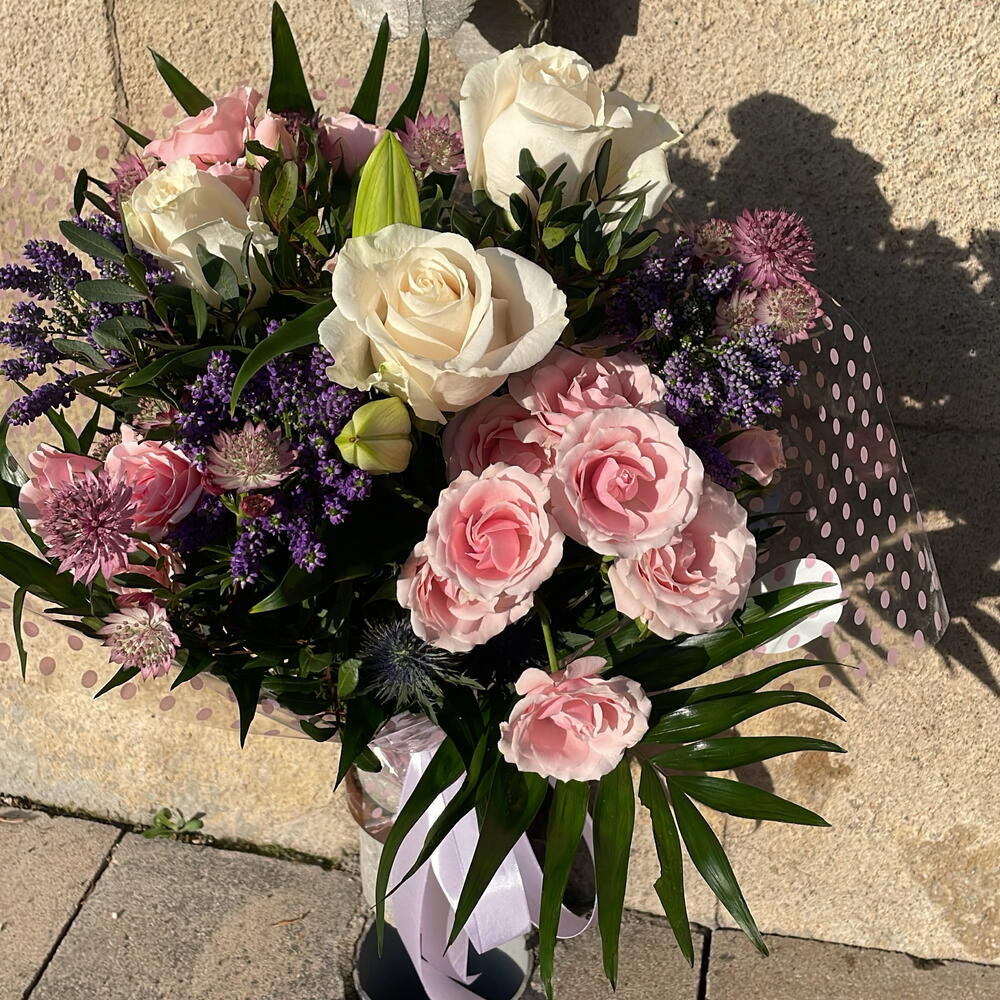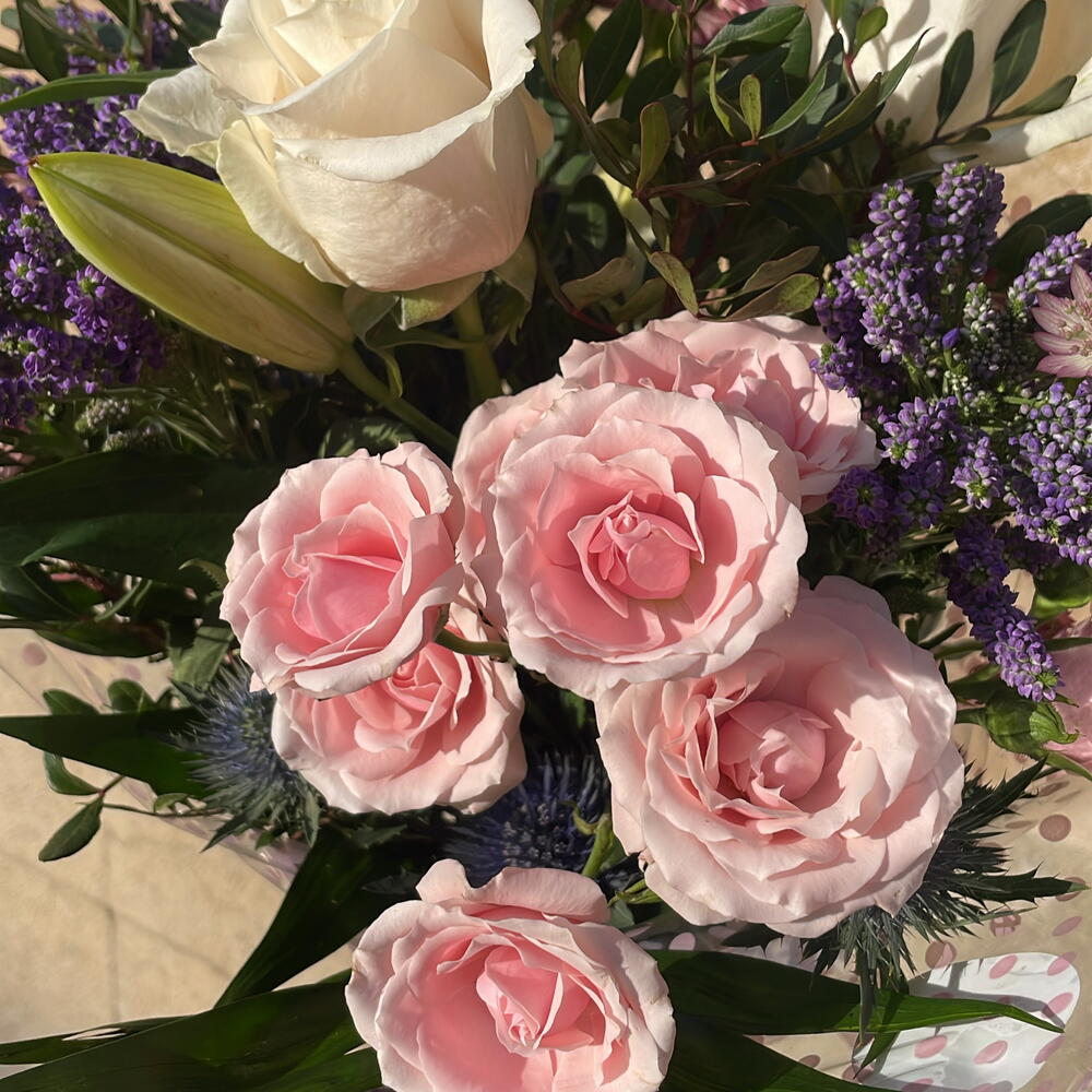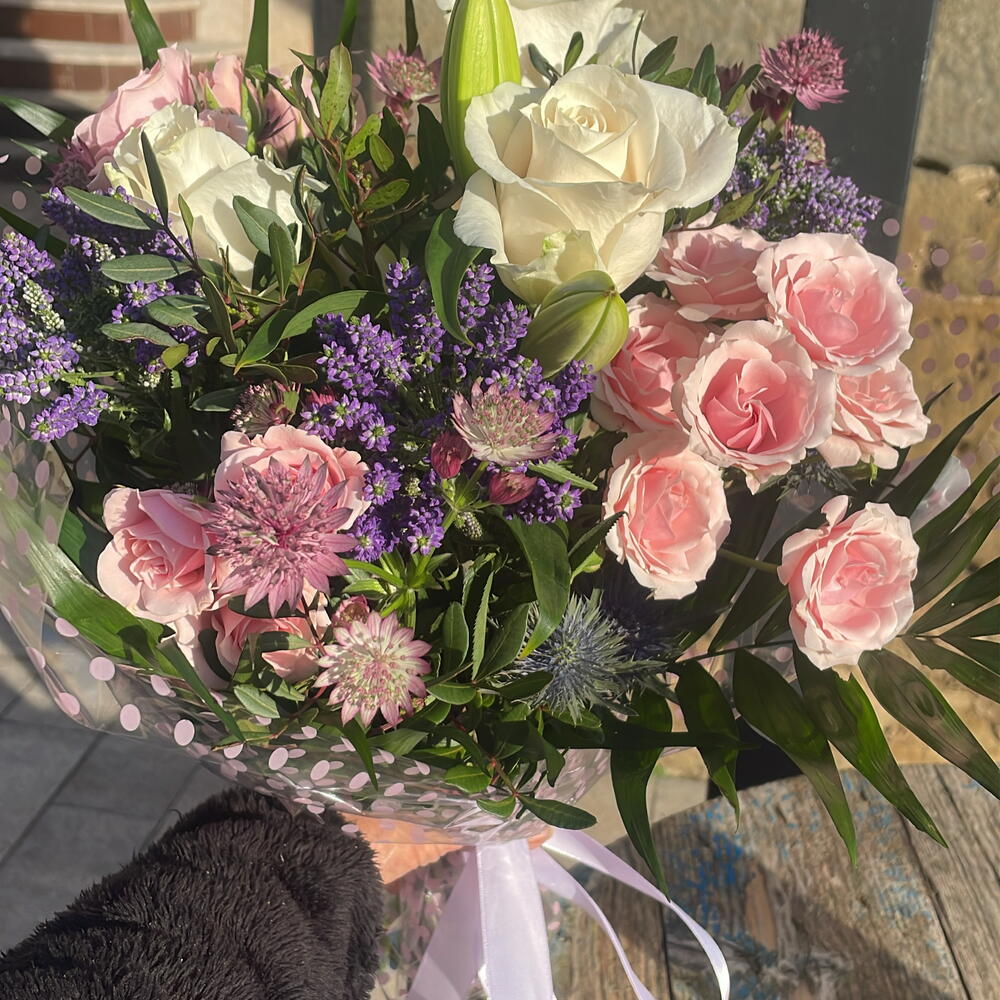 Романтичный букет в пастельно-розовых и голубых тонах. Идеально для празднования Дня матери.