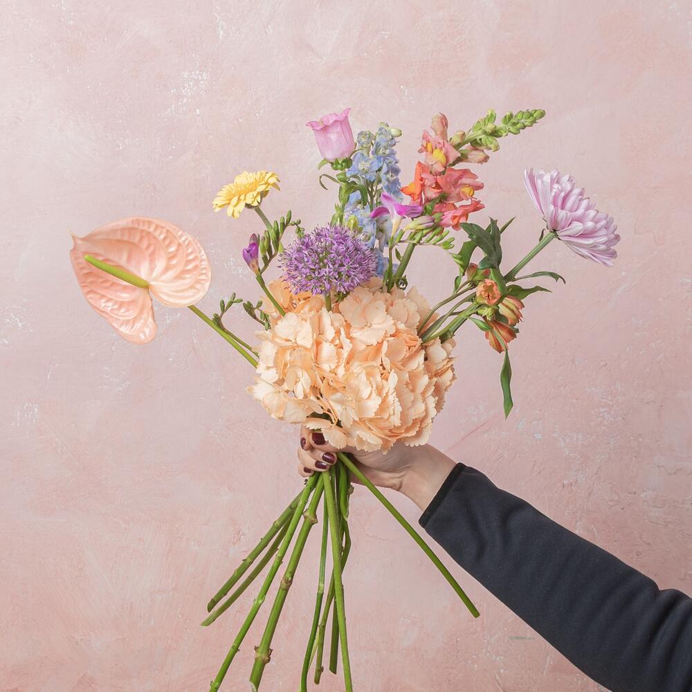 hortensia - 1 шт. Gerbera - 1 шт. Антуриум - 1 шт. delphinium - 1 шт. allium - 1 шт. crisantemo - 1 шт. колокольчик - 1 шт. оранжевый львиный зев - 2 шт.