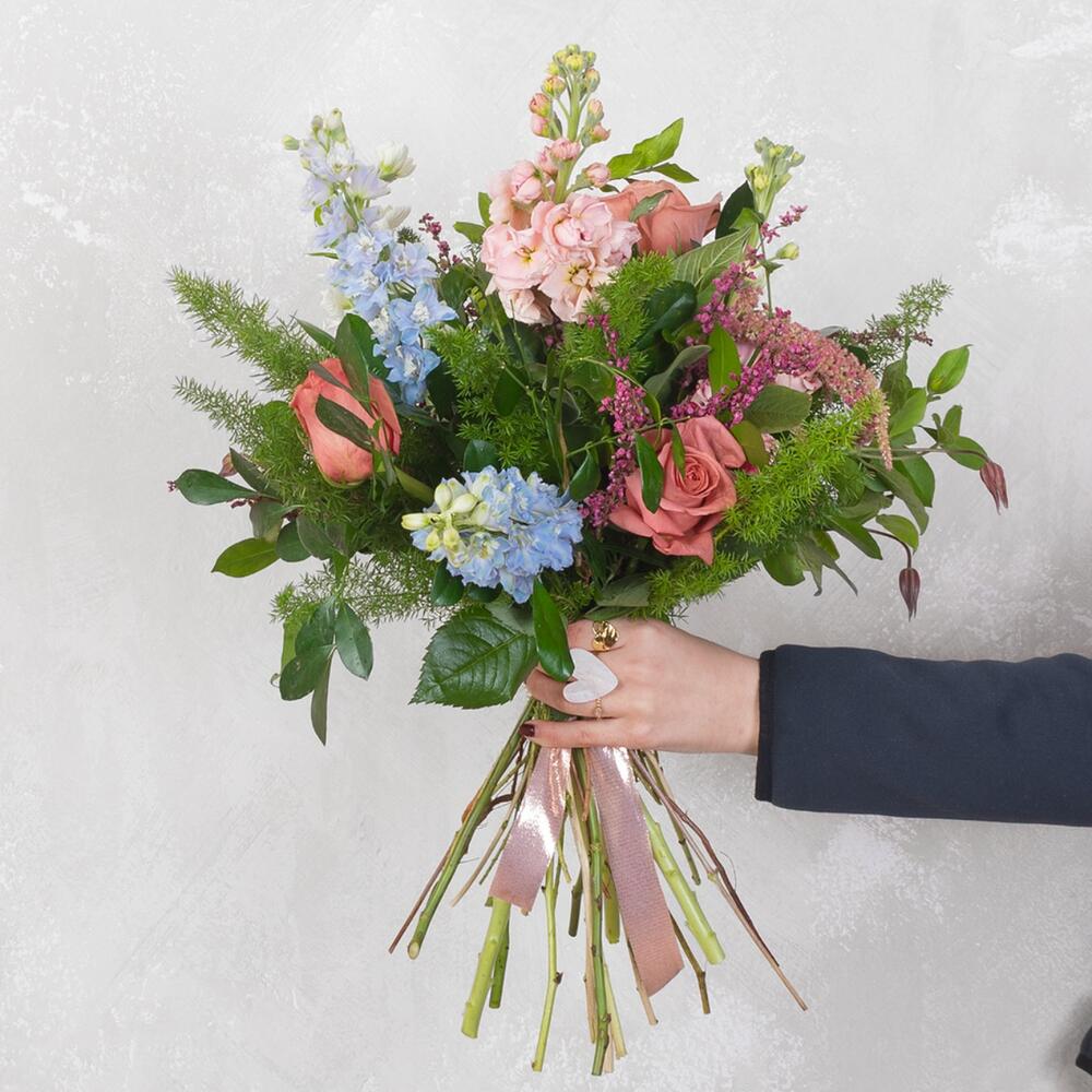 asparagus - 3 шт. astilbe - 2 шт. delphinium - 2 шт. rosas - 3 шт. разнообразная зелень - 7 шт. левкой (matthiola) - 1 шт.