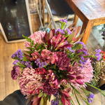 Эта фирменная цветочная композиция отличается яркой индивидуальностью и неповторимым стилем. Пять гвоздик придают композиции классический и романтичный оттенок. Три сиреневые статицы дополняют композицию, добавляя яркий цвет и экзотический шарм. Шесть видов зелени придают композиции свежесть и естественность. Три кожаных папоротника добавляют объём и текстуру. В букет также входят три нежные хризантемы «топ-спин» и пять алтарных цветов. Эта композиция идеально подойдёт для любого случая: от признания в любви до идеального украшения для уютного ужина.