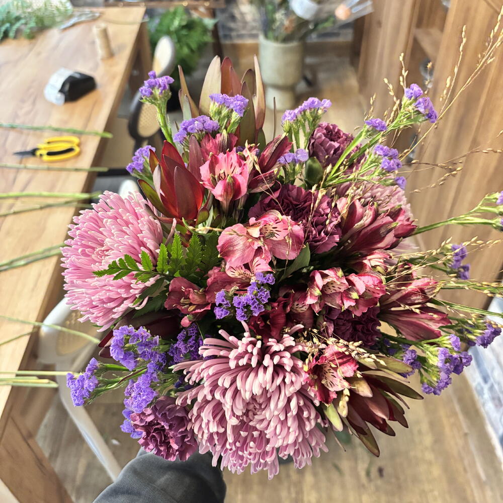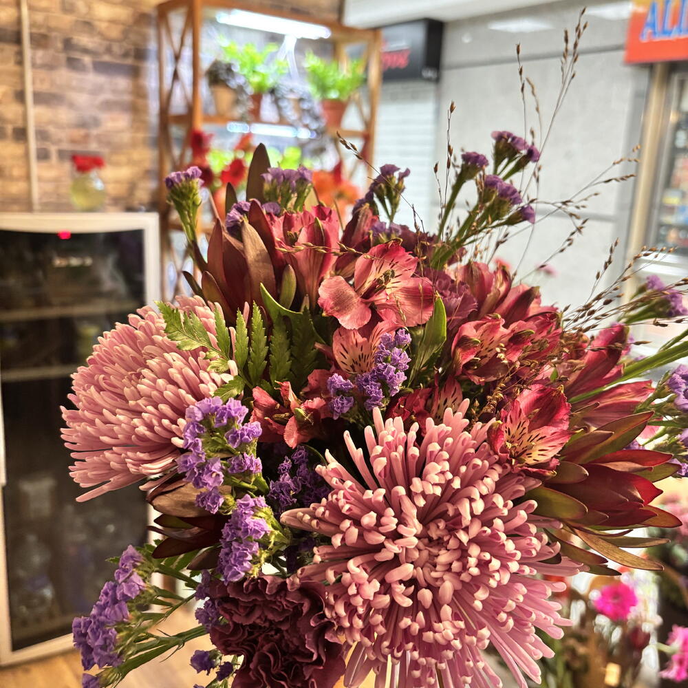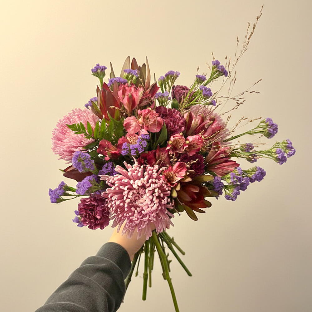 Эта фирменная цветочная композиция отличается яркой индивидуальностью и неповторимым стилем. Пять гвоздик придают композиции классический и романтичный оттенок. Три сиреневые статицы дополняют композицию, добавляя яркий цвет и экзотический шарм. Шесть видов зелени придают композиции свежесть и естественность. Три кожаных папоротника добавляют объём и текстуру. В букет также входят три нежные хризантемы «топ-спин» и пять алтарных цветов. Эта композиция идеально подойдёт для любого случая: от признания в любви до идеального украшения для уютного ужина.