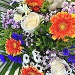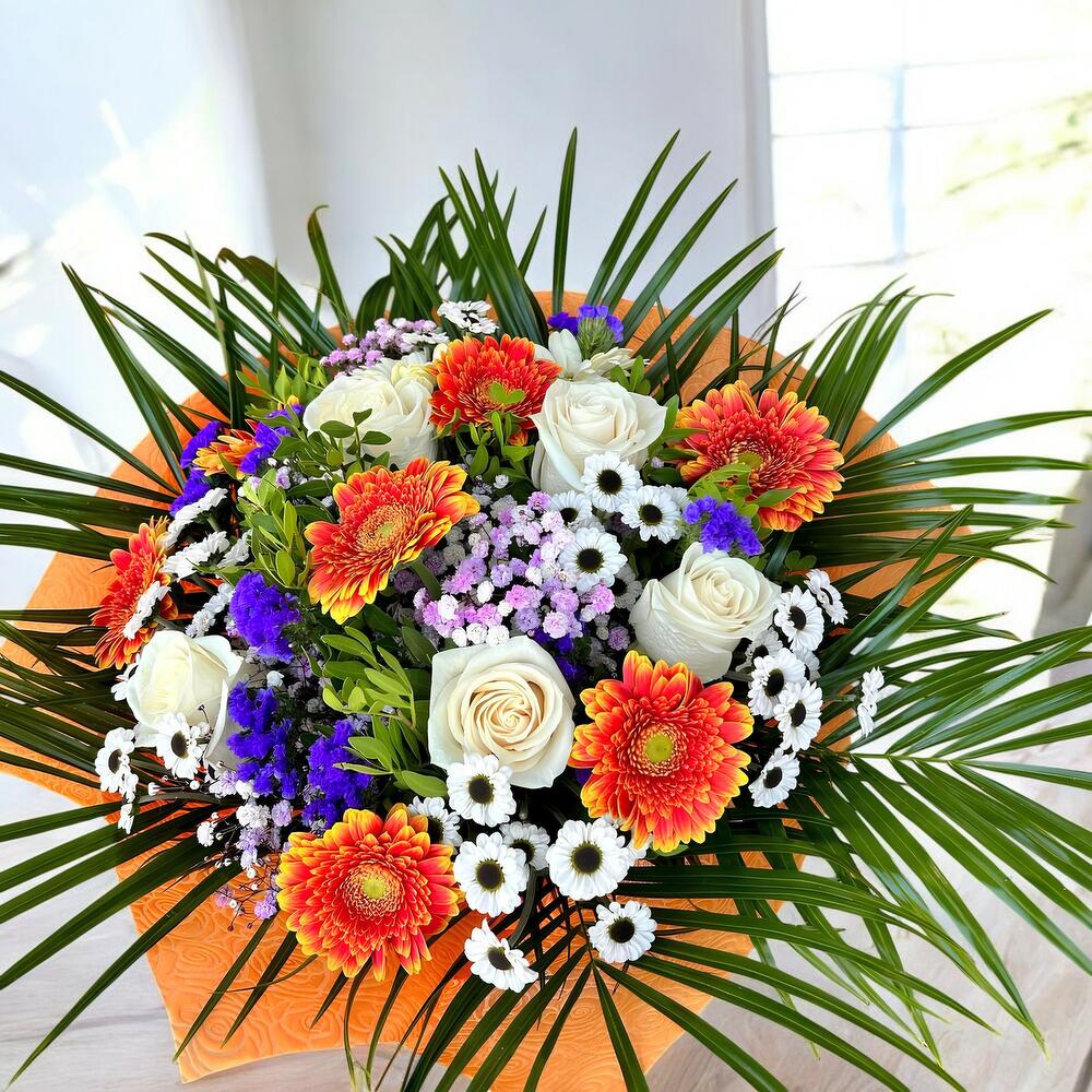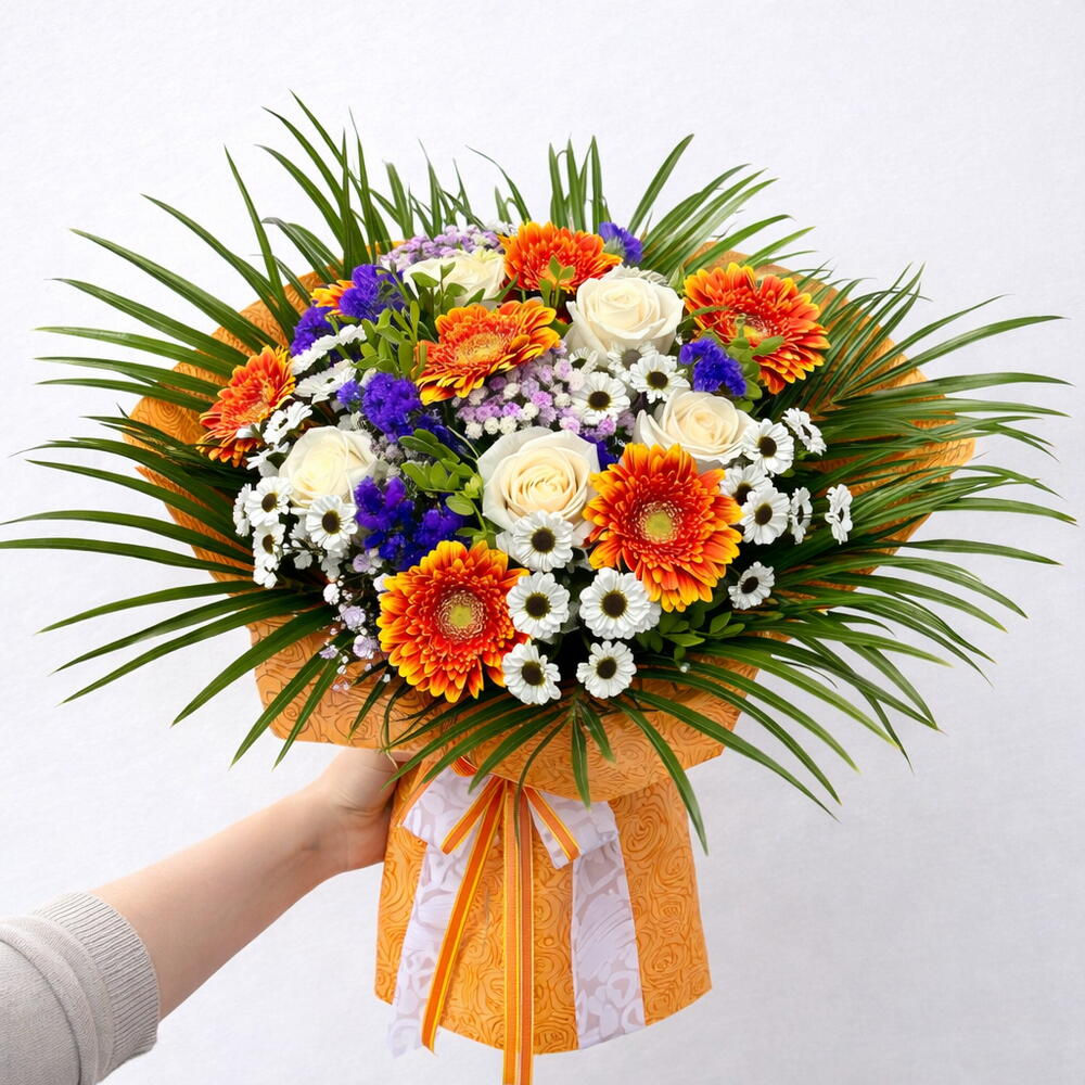 rosas blancas - 10 шт. пальмы - 10 шт. Гербера оранжевая - 10 шт. цветная гипсофила - 5 шт. лентиск - 8 шт.