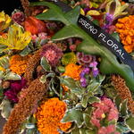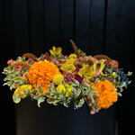 Una explosión cálida de tonos otoñales que brota desde la caja como si guardara un pequeño sol dentro. Flores doradas, naranjas y rosadas se entrelazan con texturas suaves y hojas jaspeadas, creando una composición vibrante y acogedora, llena de vida y movimiento. Un jardín íntimo atrapado en un instante.