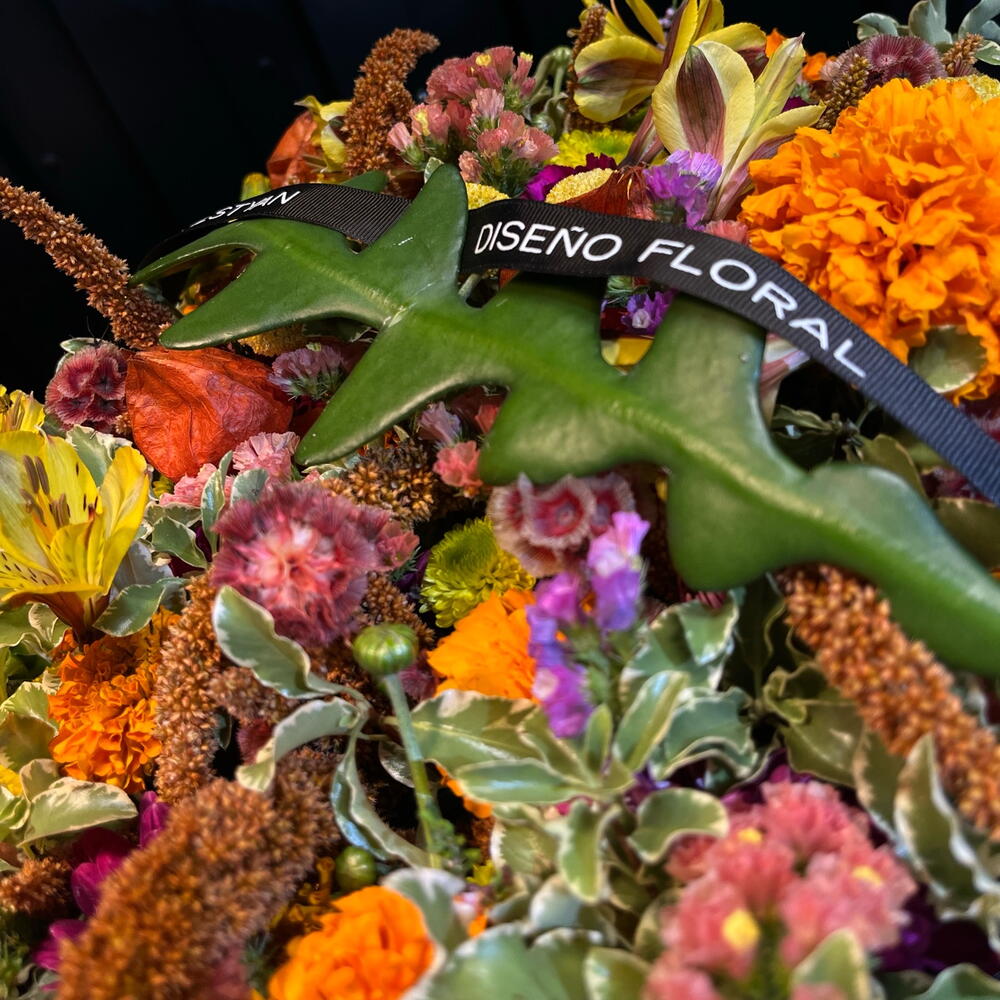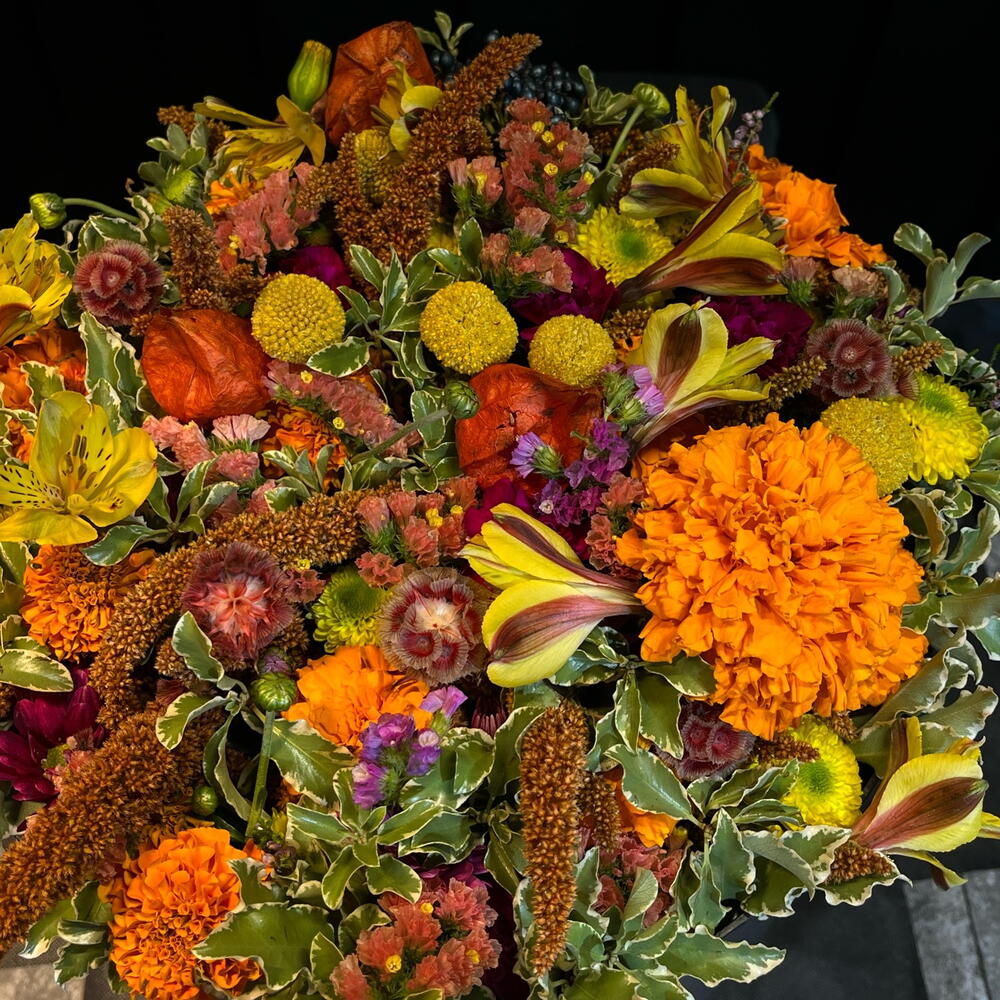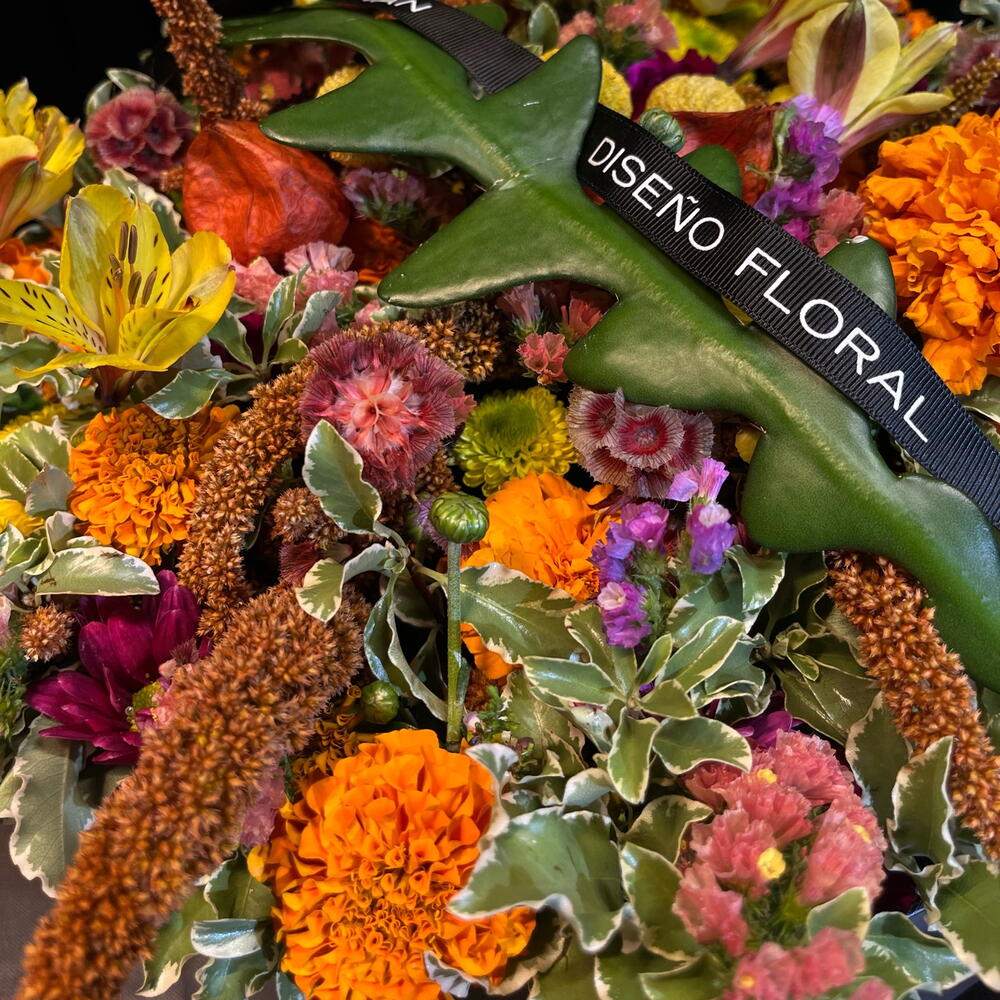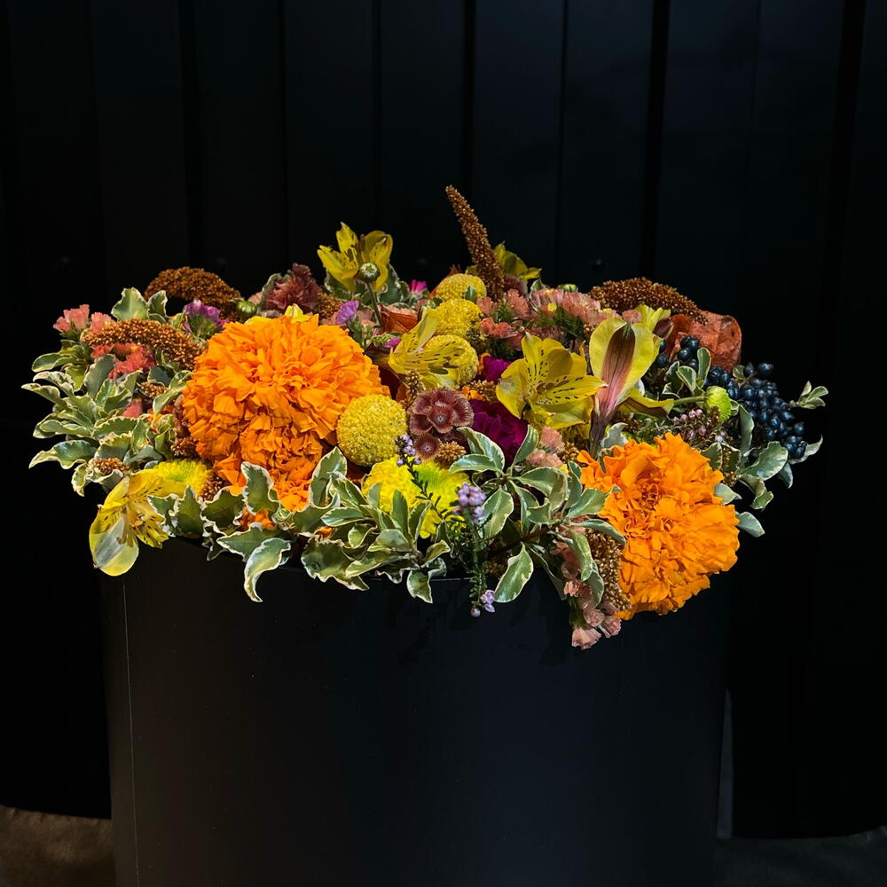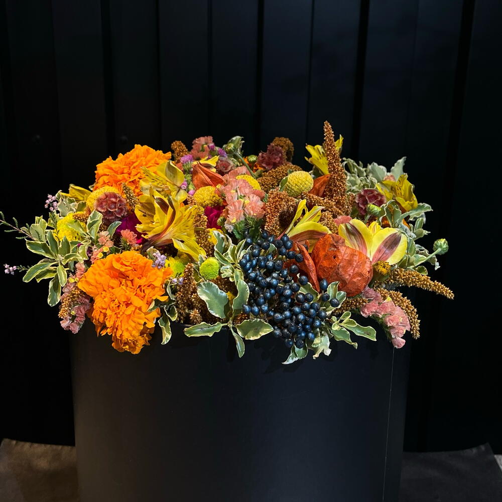Una explosión cálida de tonos otoñales que brota desde la caja como si guardara un pequeño sol dentro. Flores doradas, naranjas y rosadas se entrelazan con texturas suaves y hojas jaspeadas, creando una composición vibrante y acogedora, llena de vida y movimiento. Un jardín íntimo atrapado en un instante.