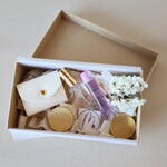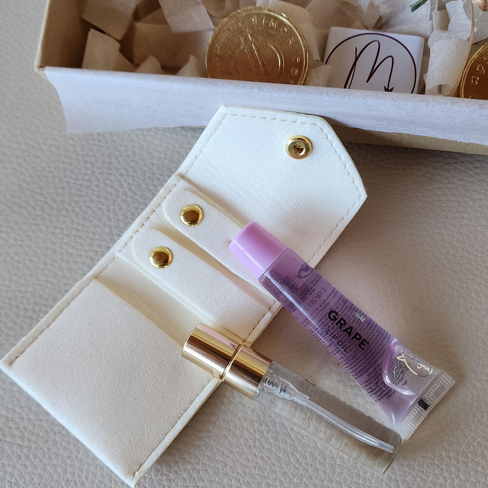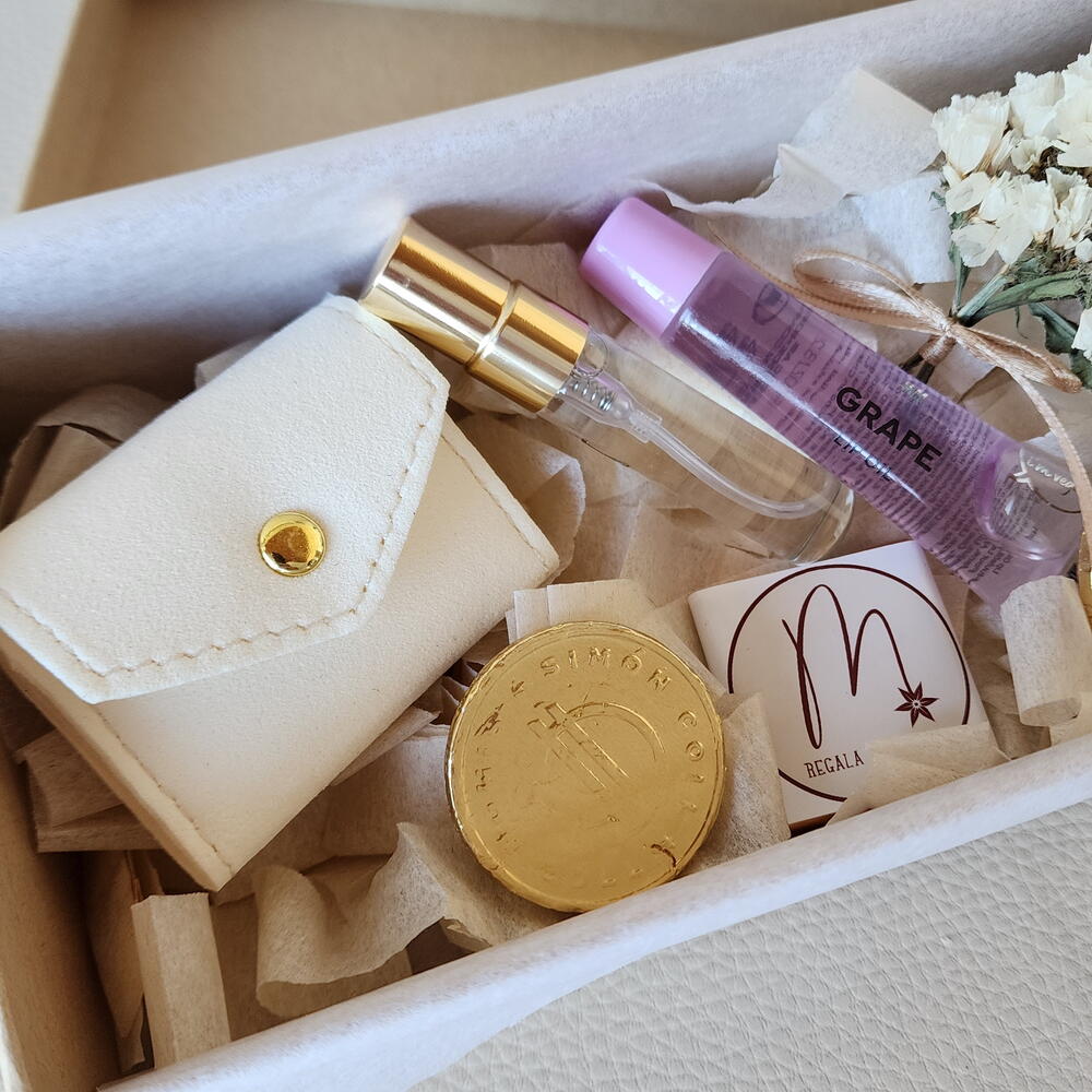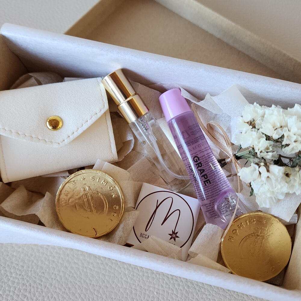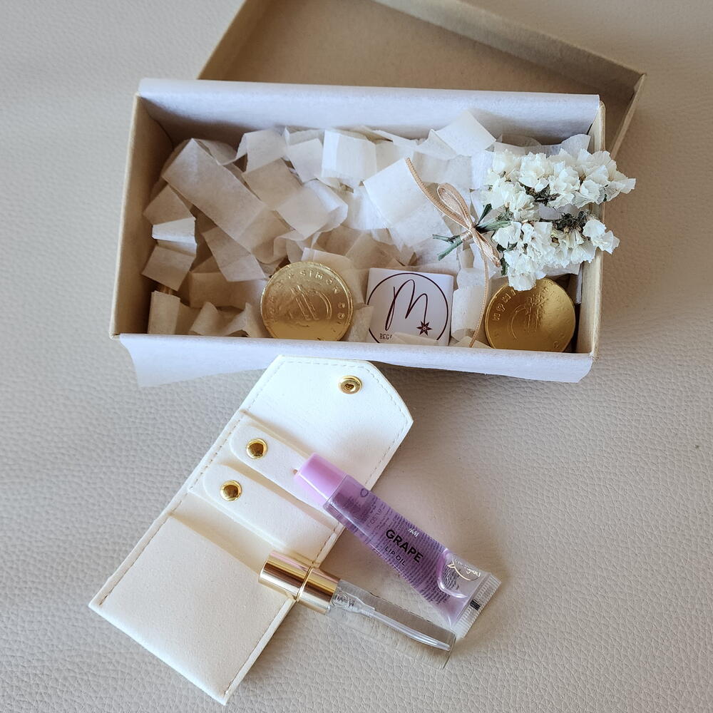 шоколадные монеты - 2 шт. мини-шоколад мамуча - 1 шт. мини-парфюм 5 мл с ароматом вербены - 1 шт. мини-шкатулка цвета слоновой кости - 1 шт. виноградный блеск для губ - 1 шт. мини букет белых сухоцветов - 1 шт.