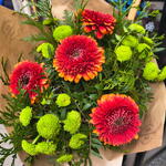 gerbera mini - 4 шт. лентиск - 3 шт. туя - 2 шт. хризантема зелёный бутон - 3 шт.