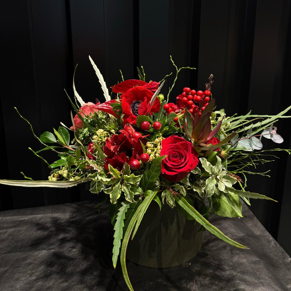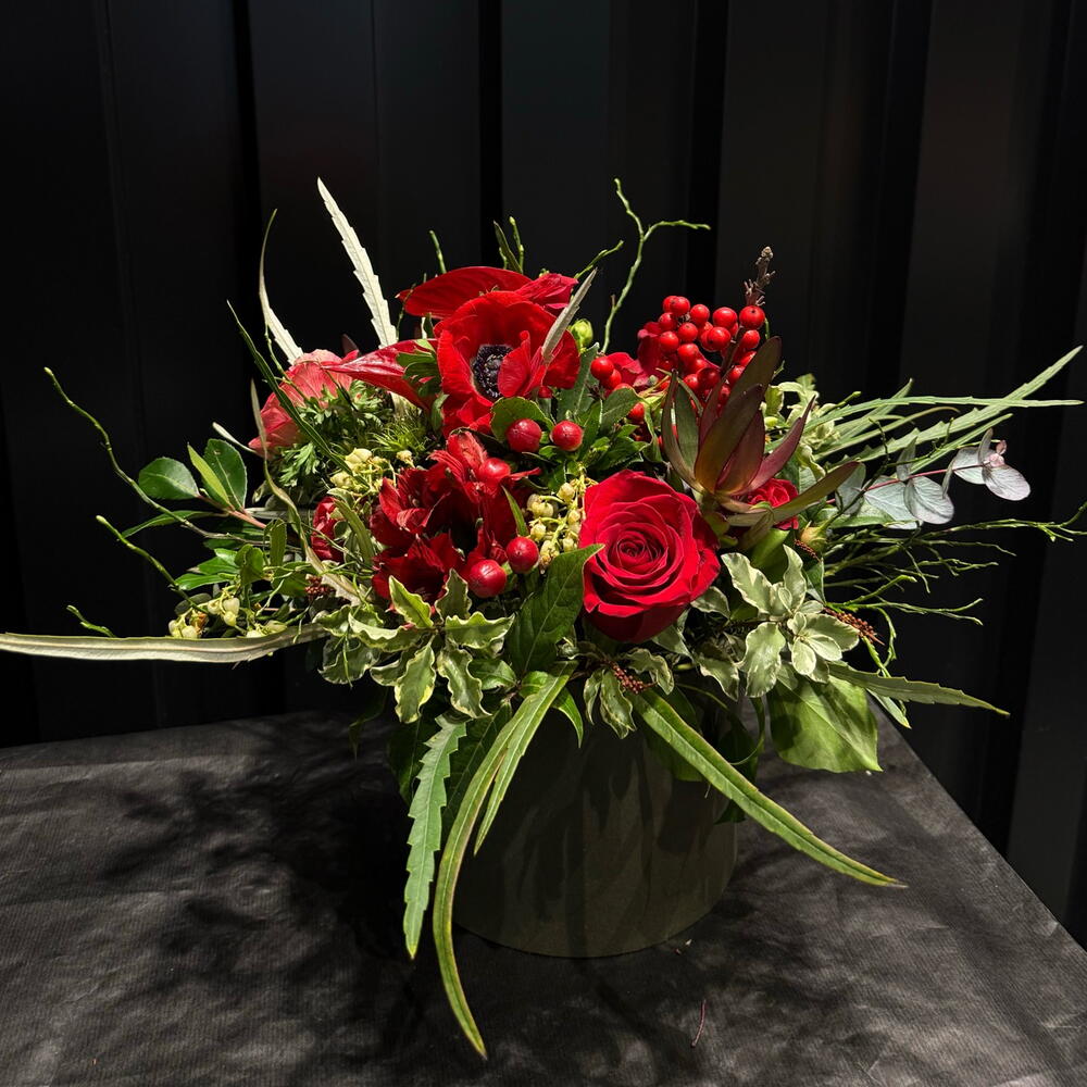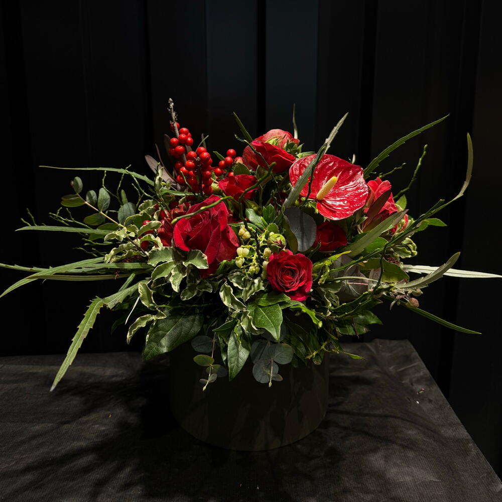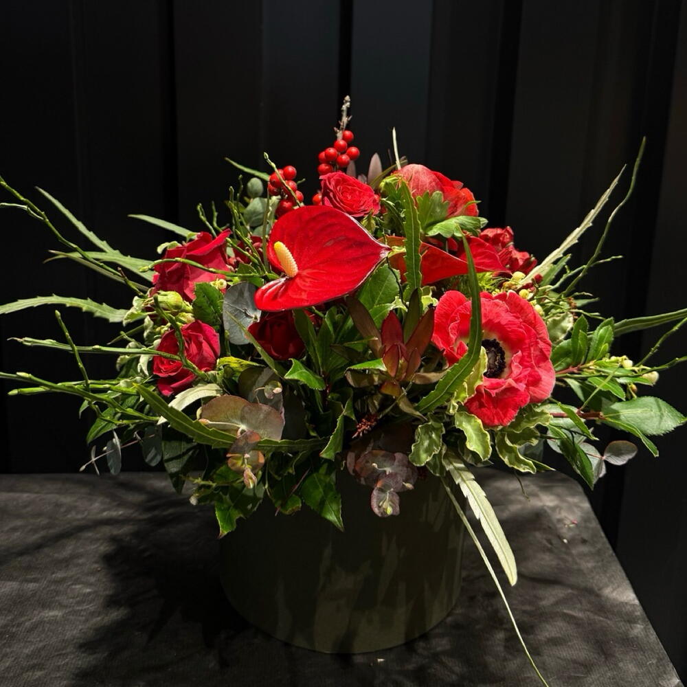 Este exquisito ramo de la categoría De autor combina la elegancia y la vitalidad en un deslumbrante arreglo floral. Compuesto por Arthurium (2 ud), un caja redonda (1 ud), Alstermeria (2 ud), Anémona (5 ud), Hypericum (2 ud), Safari (2 ud), el vibrante Ilex rojo (1 ud), delicada Rosa Ramificada (1 ud), la icónica Rosa Freedom (2 ud) y finaliza con el toque romántico del Poeta (2 ud). Las flores, seleccionadas cuidadosamente, despliegan un caleidoscopio de colores y texturas que logran un efecto visual armonioso y delicado. Un detalle perfecto para cualquier ocasión que seguro impresionará.