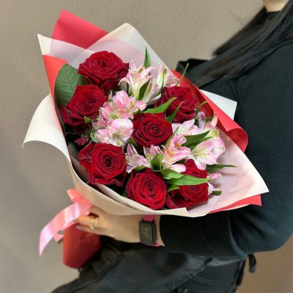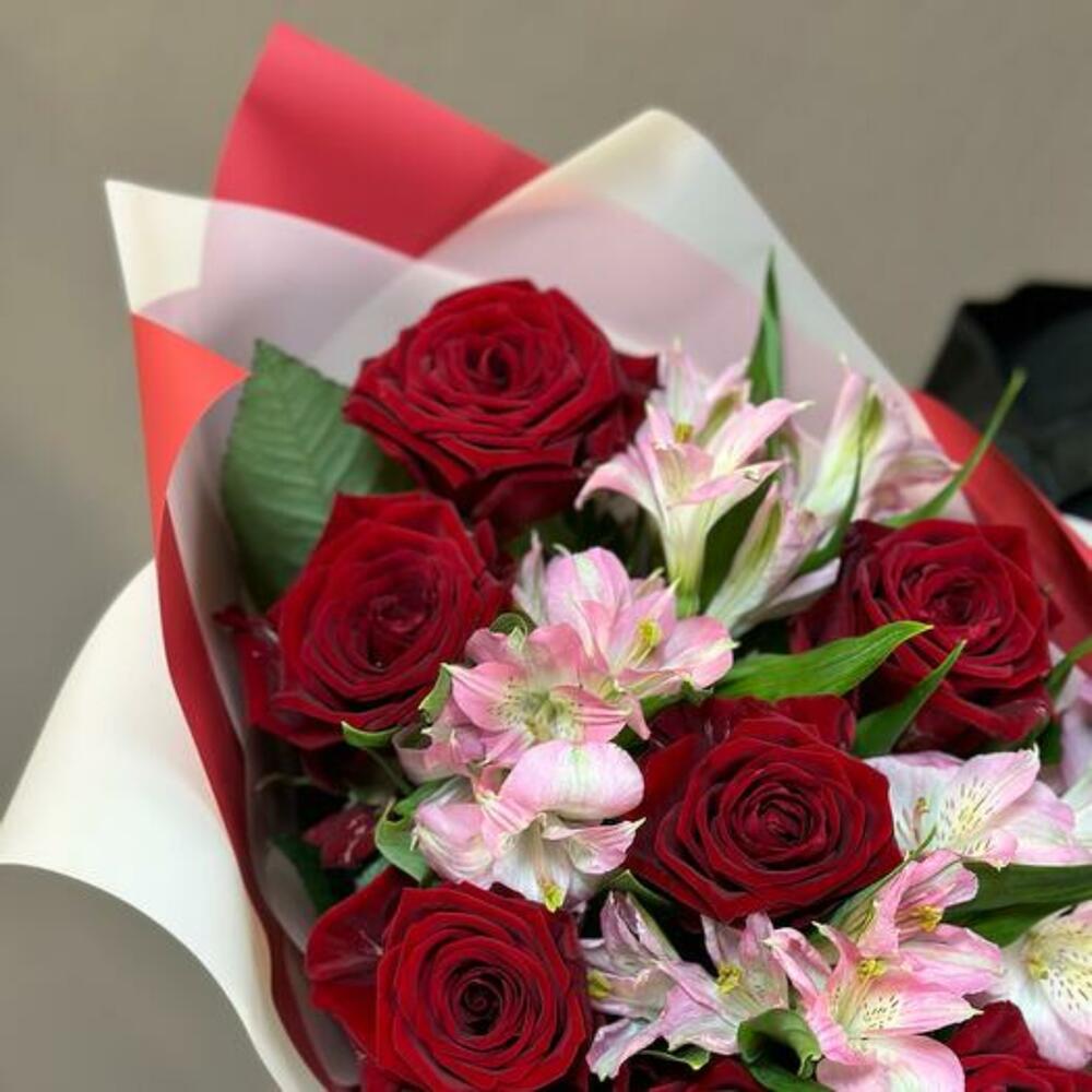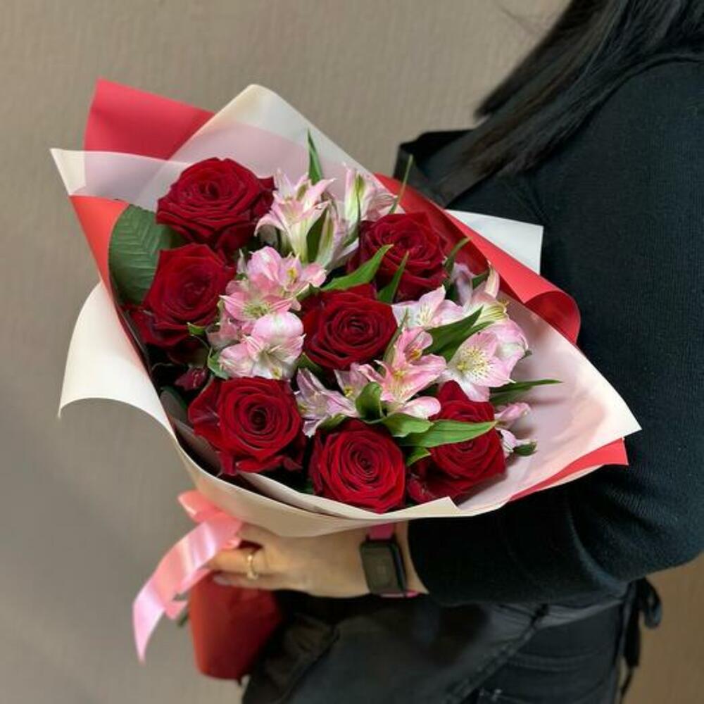 Alstroemeria - 4 шт. cinta de raso - 1 шт. embalaje - 1 шт. красная роза - 7 шт.