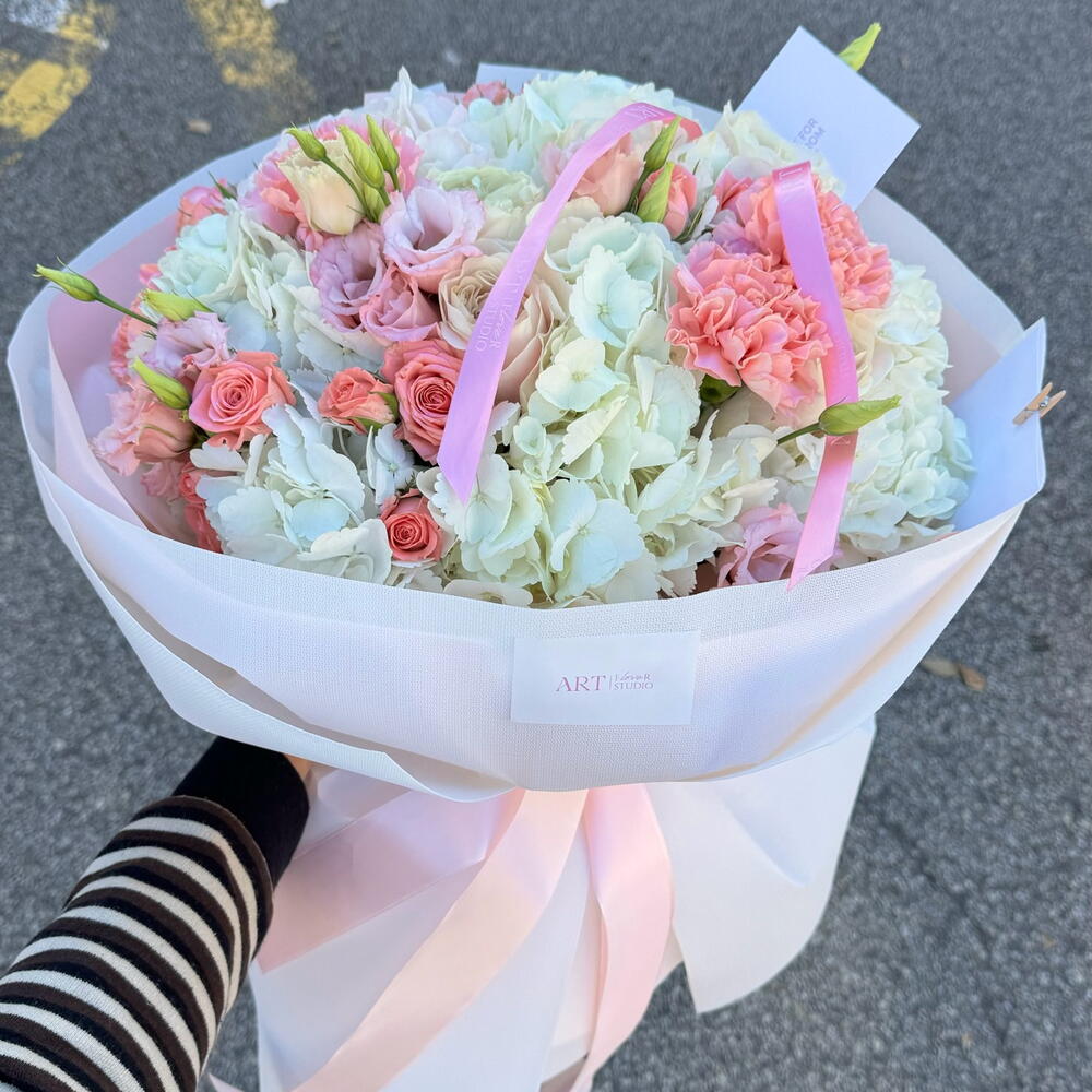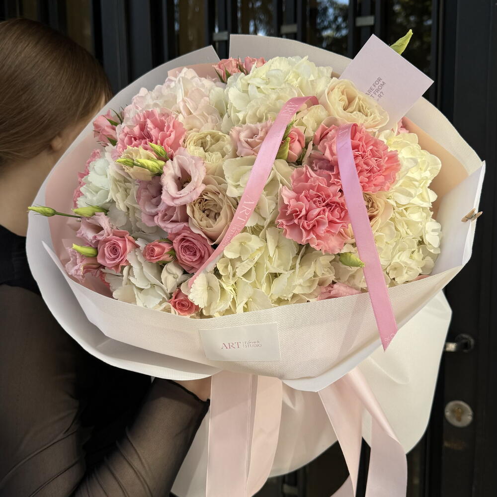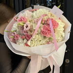 Гортензия - 5 шт. Кустовая роза - 5 шт. Гвоздика - 4 шт. Эустома - 4 шт. Роза одноголовая Микс - 4 шт.